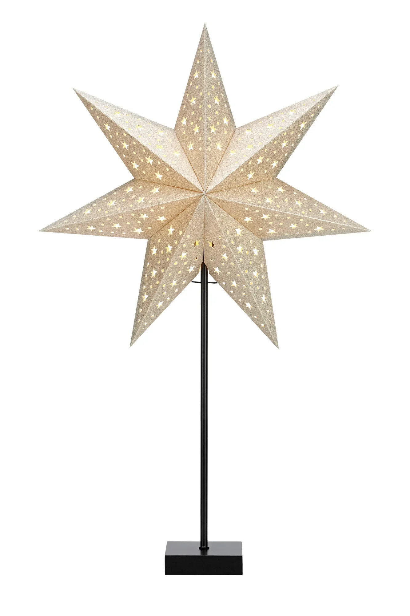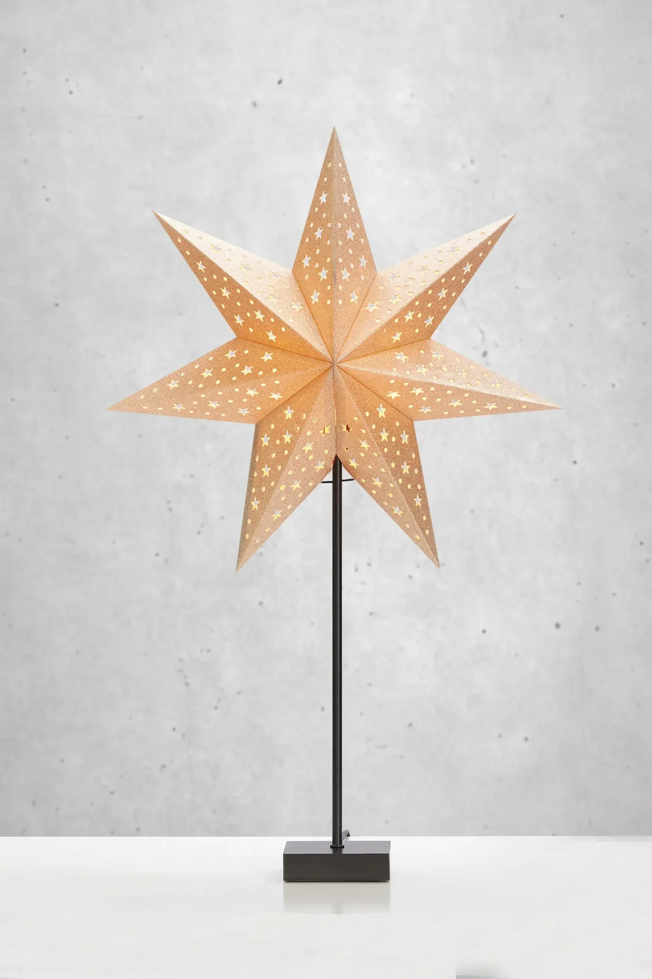 Stolní hvězda Solvalla je navržena v tradičním severském stylu, který v sobě snoubí jednoduchost a eleganci. Zlaté tóny a jemné vzory hvězdiček v papírovém stínidle podtrhnou slavnostní atmosféru a vyniknou jak na parapetu, tak na komodě nebo stole. Stabilní podstava z černého kovu a dřeva zajistí, že bude hvězda vždy bezpečně stát.