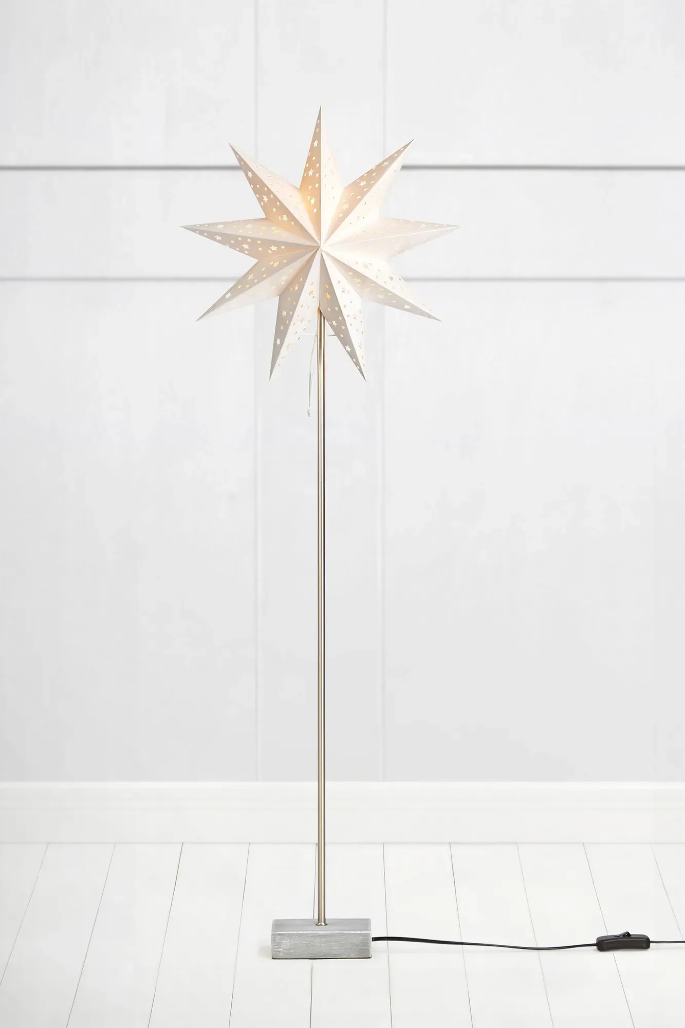Stojací lampa Markslöjd Svan v podobě bílé papírové hvězdy je stylovým a efektním doplňkem pro váš interiér, zejména v období Vánoc. Hvězda o průměru 30 cm je vyrobena z kvalitního papíru a je dekorována drobnými perforacemi, které po rozsvícení vytvářejí příjemné, hřejivé světelné efekty. Stabilní základna z polyresinu a kovový stojan garantují bezpečné umístění na podlahu i dlouhou životnost svítidla. Celková výška lampy je 99 cm, což z ní dělá výrazný solitér do obývacího pokoje, dětského pokoje nebo vstupní haly.