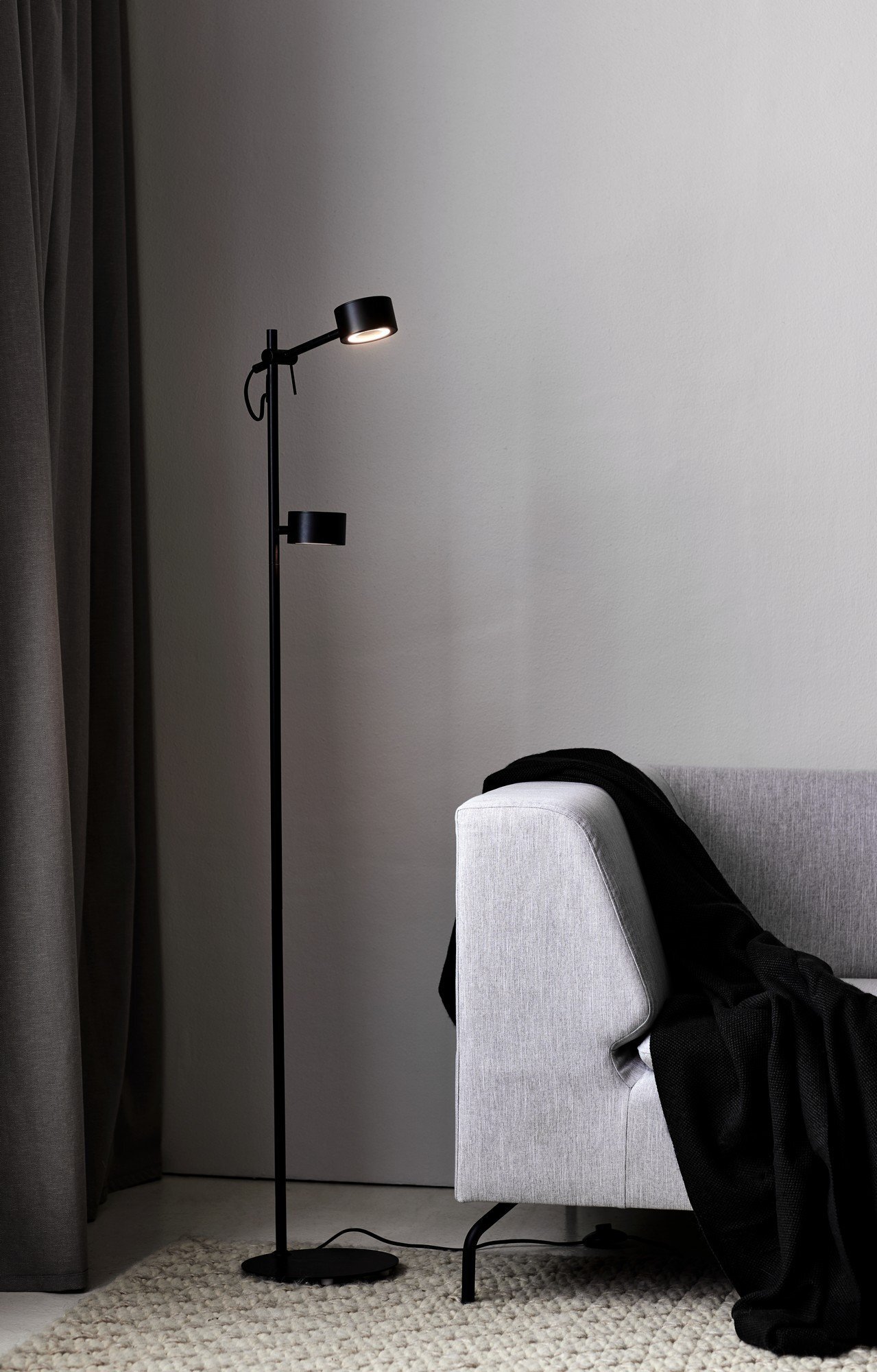 Stojací lampa Clyde od značky Nordlux spojuje štíhlý nordický design s inovativní technologií. Díky zabudované funkci Moodmaker můžete jednoduše přizpůsobit osvětlení svým potřebám prostřednictvím běžného nástěnného vypínače. Tato lampa s dvěma hlavami je ideální vedle pohovky nebo oblíbeného křesla, protože poskytuje skvělé čtecí světlo i příjemné teplé osvětlení na večer. Horní hlava lampy je nastavitelná nahoru a dolů dle potřeby.