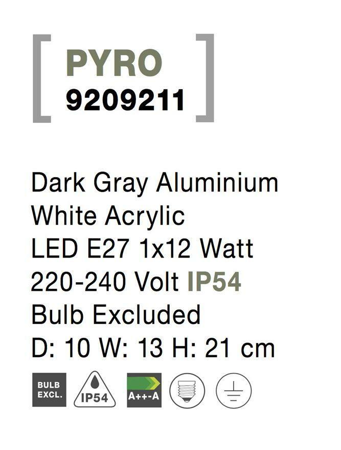 Svítidlo NOVA LUCE PYRO vyniká svým jednoduchým geometrickým tvarem a univerzální šedou barvou, která skvěle doplní jakýkoliv typ fasády. Díky akrylovému difuzoru je světlo měkce rozptýleno a nevytváří rušivé stíny. Ideální pro montáž na stěnu u vstupních dveří, garáže, pergoly či na terasovou zeď.