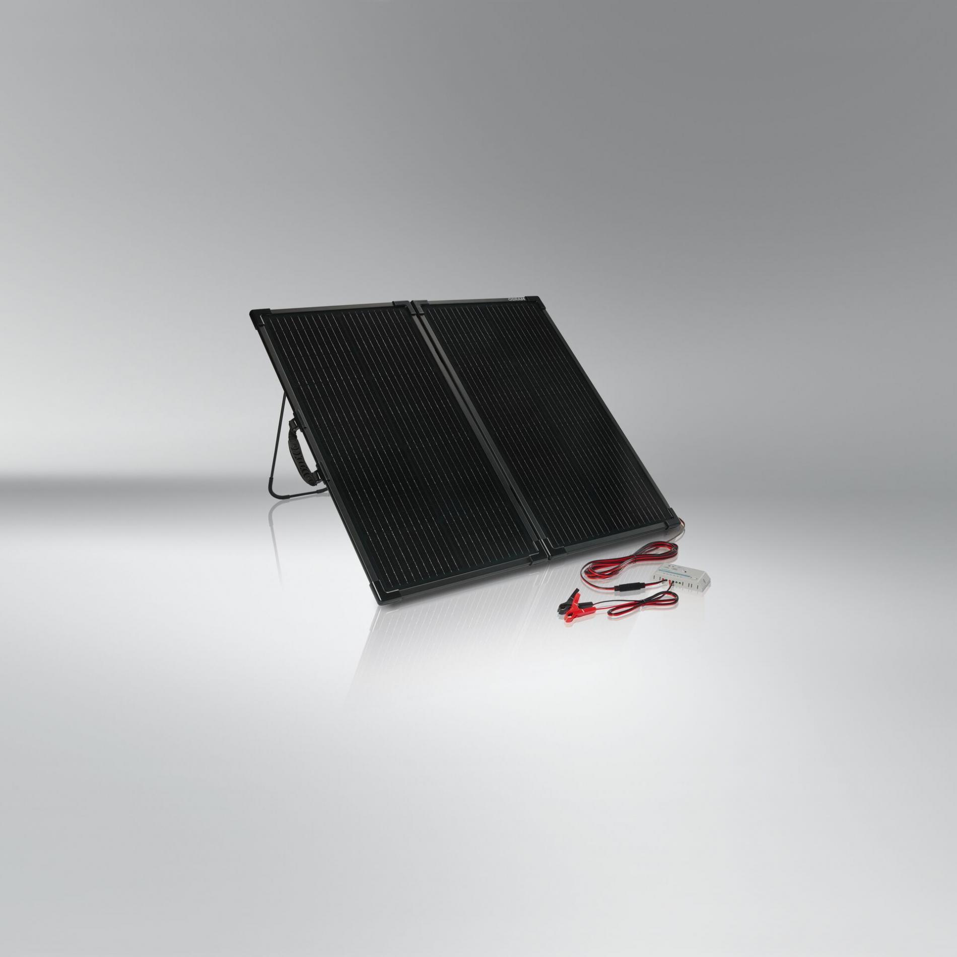 OSRAM BATTERYcharge SOLAR 100W je vysoce výkonný přenosný solární panel určený k nabíjení a údržbě 12V baterií pro volný čas. Díky výkonným monokrystalickým článkům v odolném hliníkovém rámu poskytuje až 100 W solární energie – ideální řešení pro karavany, obytné vozy, lodě i kemping.
