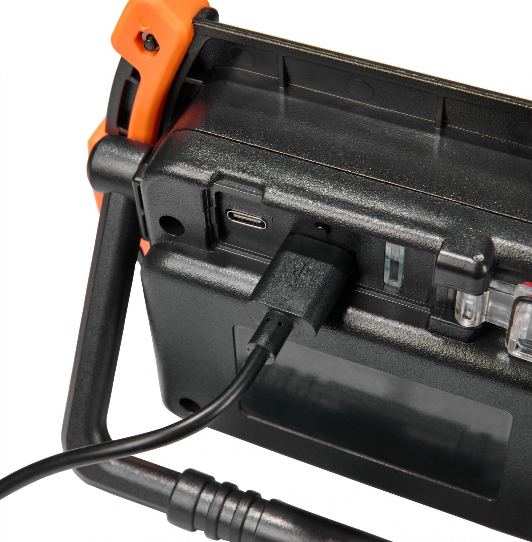 Lehká konstrukce a kompaktní rozměry umožňují snadné přenášení i rychlé umístění svítilny podle potřeby. Odolné provedení v kombinaci černé a oranžové barvy odpovídá profesionálnímu použití a zajišťuje dlouhou životnost při běžném pracovním zatížení.