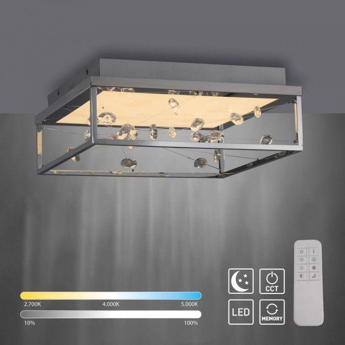 Výška: 153 mm, Dálkové ovládání: ano, Stmívatelné: ano, Hmotnost: 5500g, Šířka: 395mm, Délka: 395mm, Světelný tok: 2000lm, Barva světla: 2700-5000K, Příkon: 36W, Celkový příkon: 40W, Napětí: 220-240V, Patice: LED, Vč. světelného zdroje: ano, Materiál: železo, Barva: chrom, Počet světelných zdrojů: 1