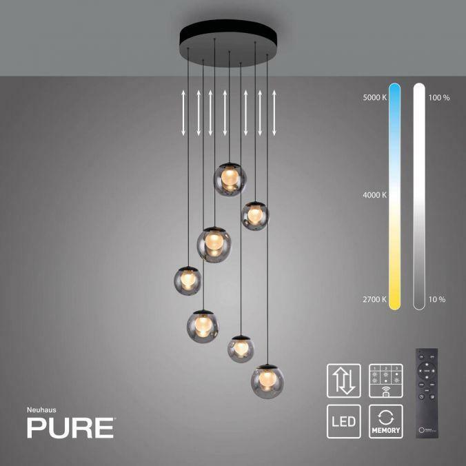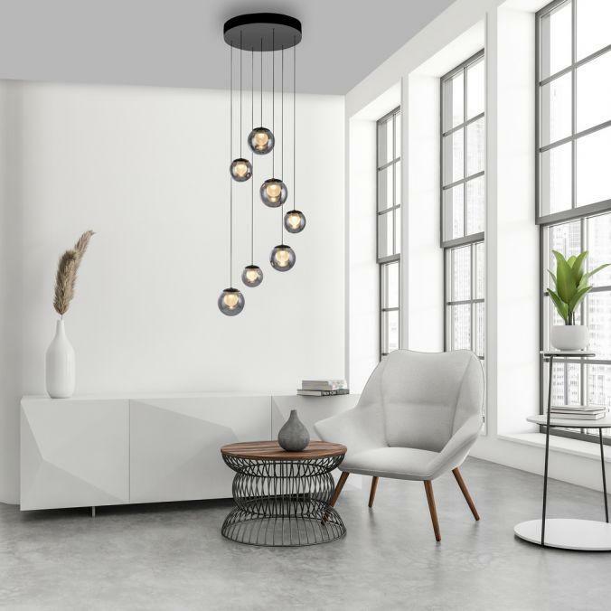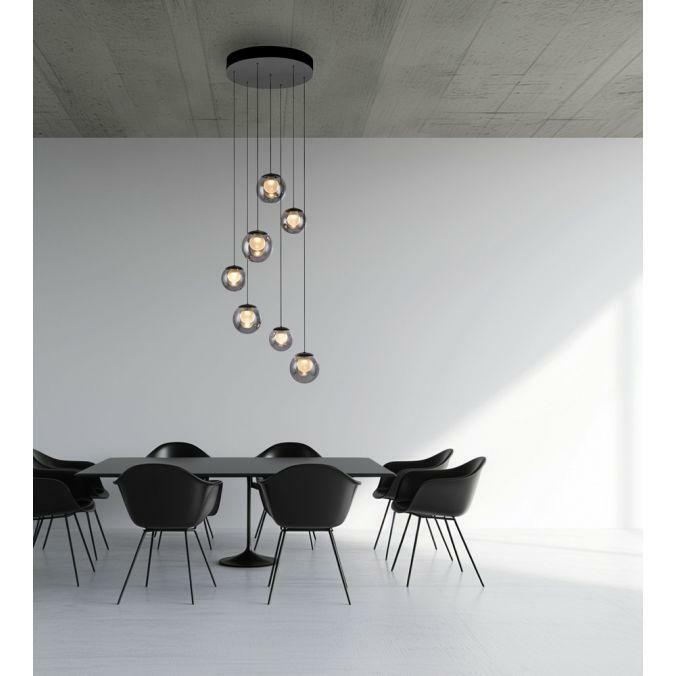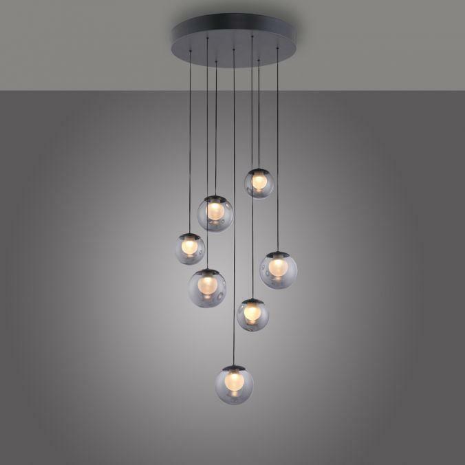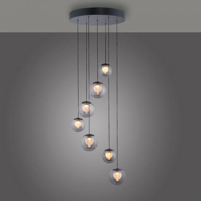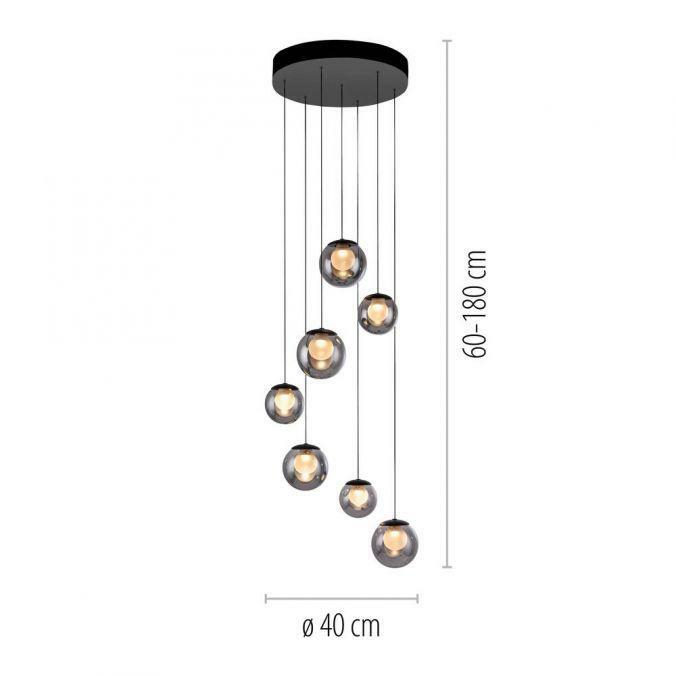 Výška: 1800 mm, Dálkové ovládání: ano, Stmívatelné: ano, Hmotnost: 5850g, Průměr: 400mm, Světelný tok: 800lm, Barva světla: 2200-5000K, Příkon: 3W, Celkový příkon: 27W, Napětí: 220-240V, Patice: LED, Vč. světelného zdroje: ano, Materiál: sklo, Barva: šedá, Počet světelných zdrojů: 7