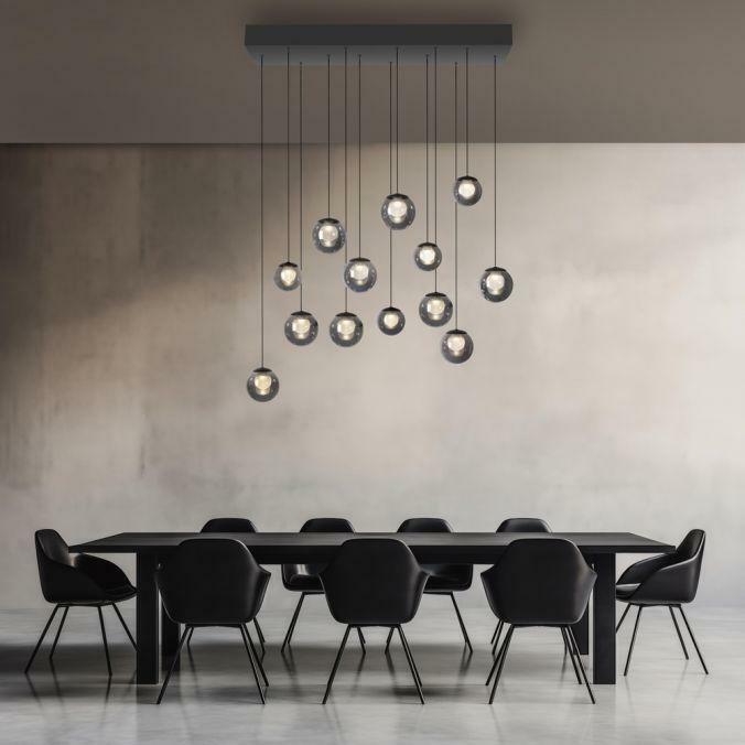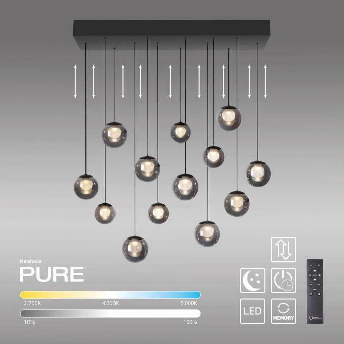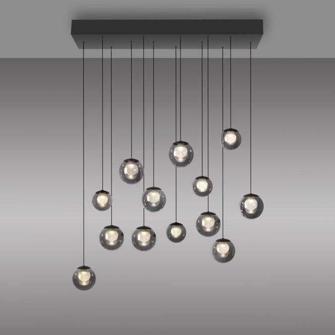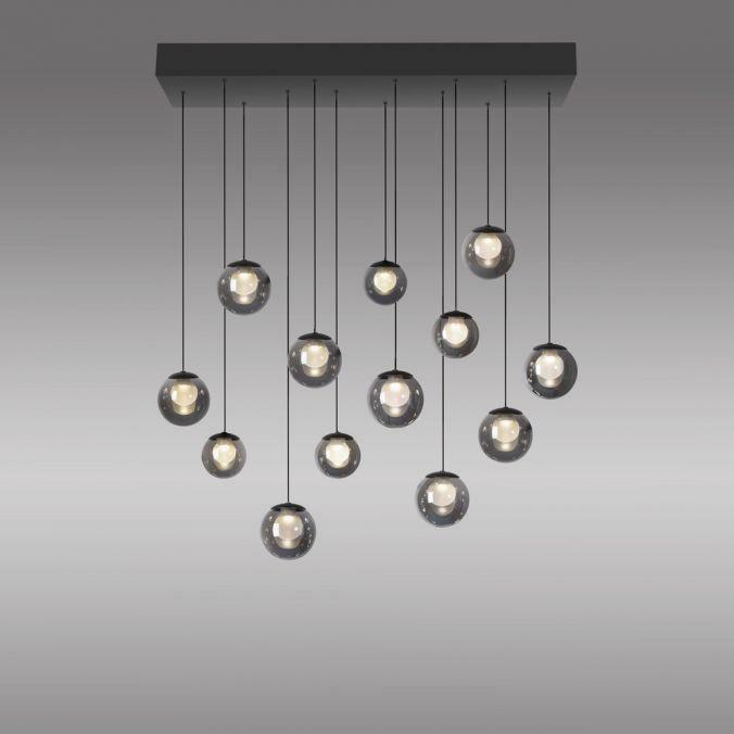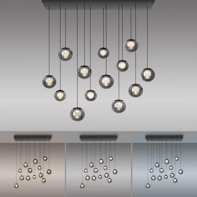 Závěsné svítidlo PURE Popup v elegantní mystické šedé představuje dokonalé spojení estetiky a inovativní technologie. Třináct designových kouřových skleněných koulí ve dvou velikostech vytváří harmonické a působivé světelné centrum každého interiéru. Ideální volba nad jídelní stůl, do obývacího pokoje nebo moderní kuchyně.