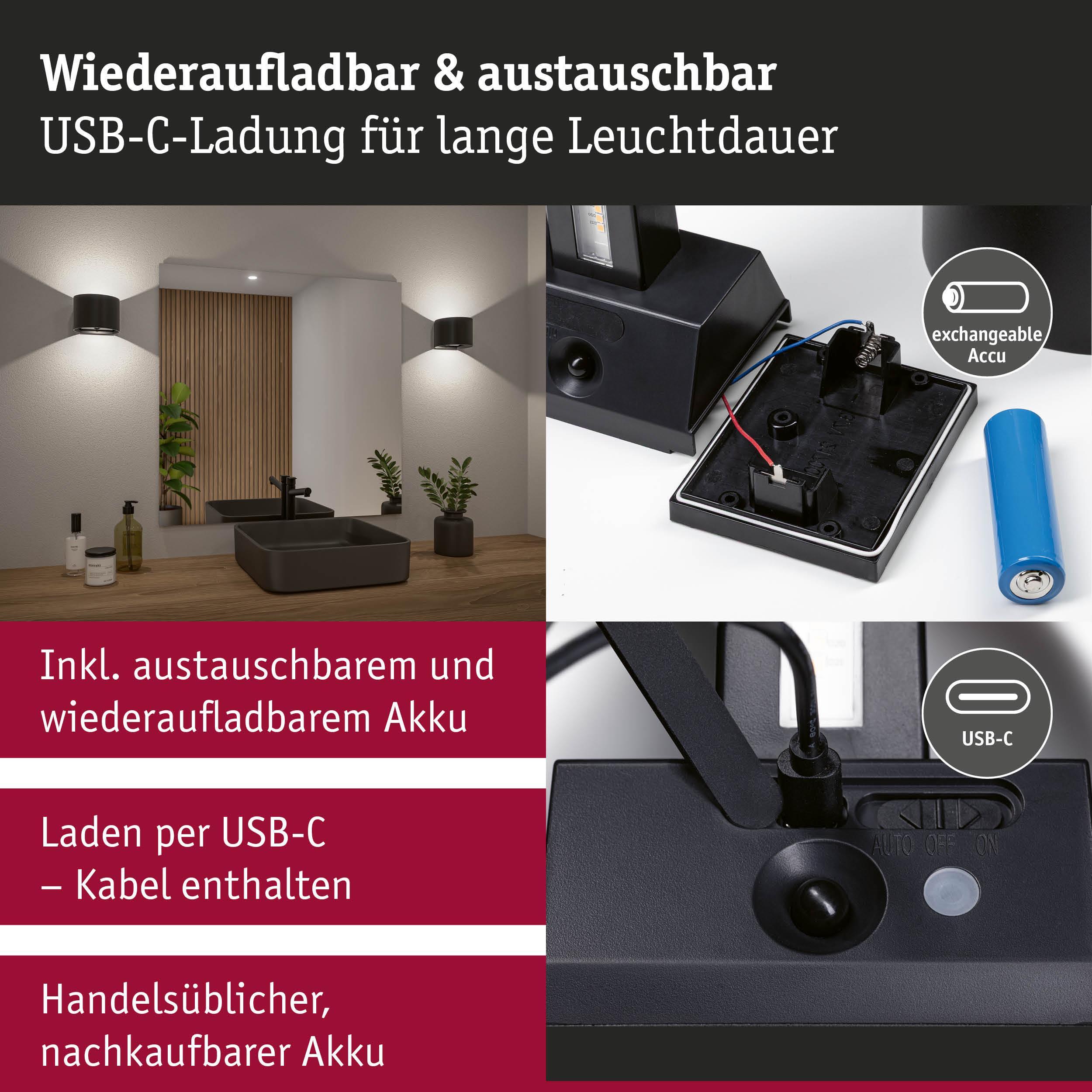 PAULMANN LED nabíjecí nástěnné svítidlo Nyora IP44 3000K 135x120mm 2x1W černá