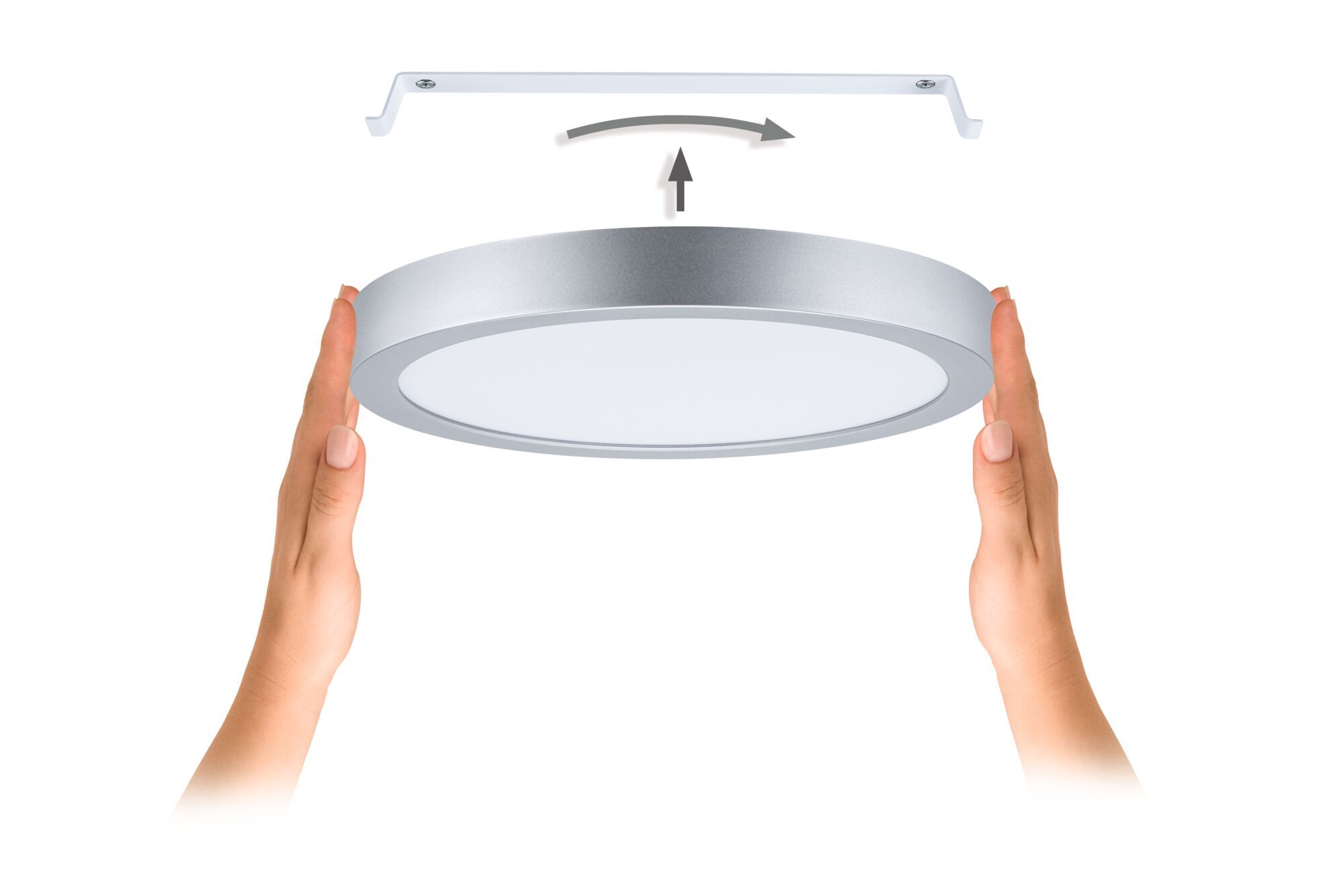 Panel má kruhový tvar o průměru 300 mm a nízký profil (výška 33 mm). Rám je vyroben z plastu v matném chromu, což působí moderně a nadčasově. Povrchová úprava je decentní a snadno zapadne do různých stylů interiéru. Konstrukce je navržena pro stropní montáž bez viditelných spojů.