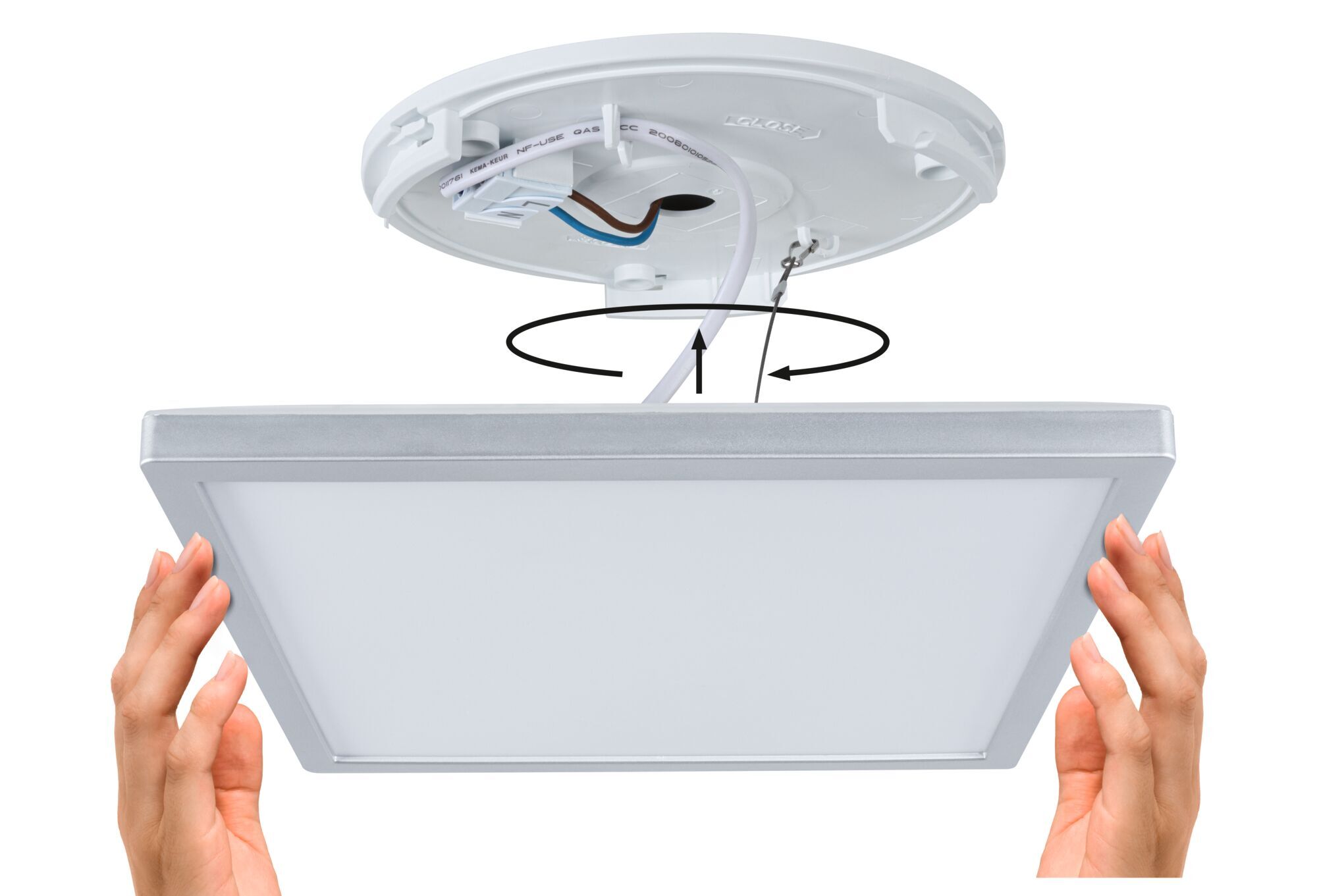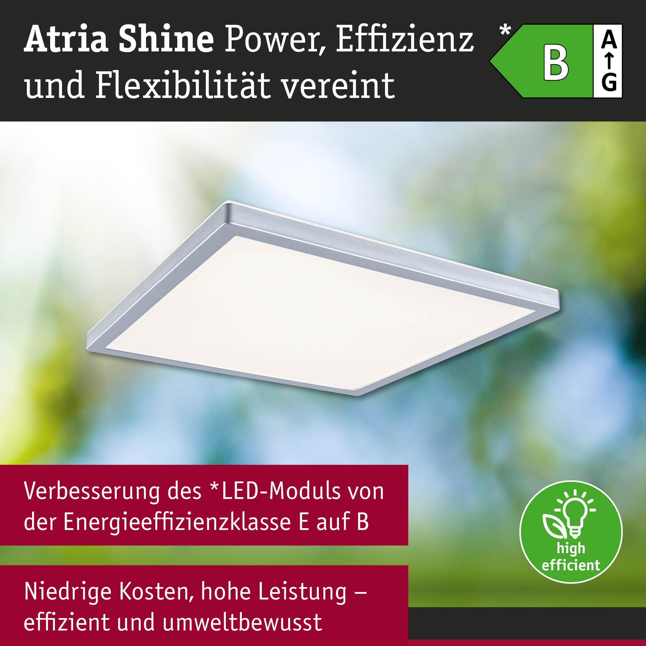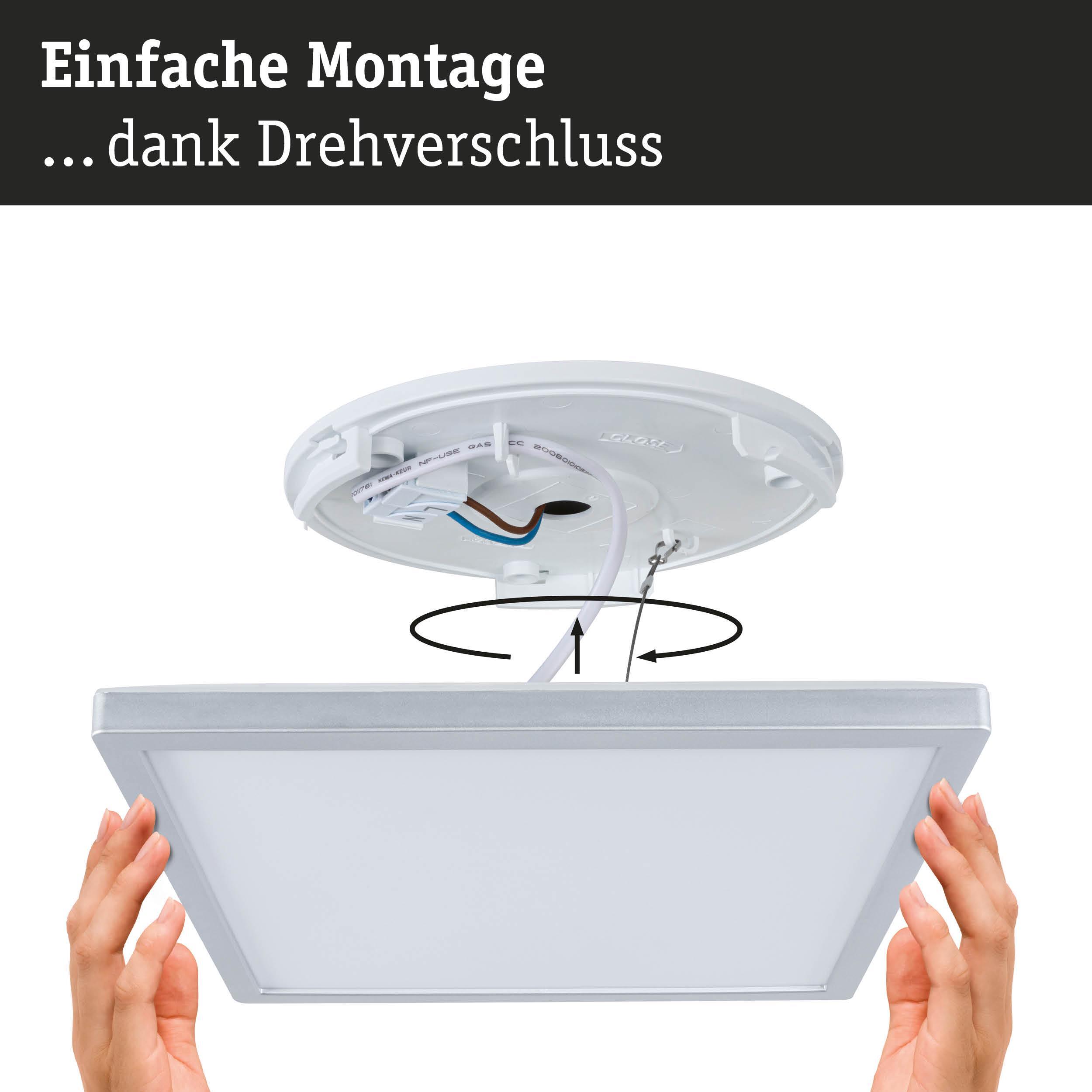 Výška: 35 mm, Třída ochrany: II, Stmívatelné: ne, Životnost: 30000h, Energetická třída: B, Index podání barev Ra: 80, Šířka: 298mm, Délka: 298mm, Ochrana IP: IP44, Světelný tok: 2100lm, Barva světla: 3000-6500K, Příkon sv. zdroje: 15,7W, Celkový příkon: 18W, Patice: LED, Vč. světelného zdroje: ano, Materiál: plast, Barva: matný chrom, Počet světelných zdrojů: 1
