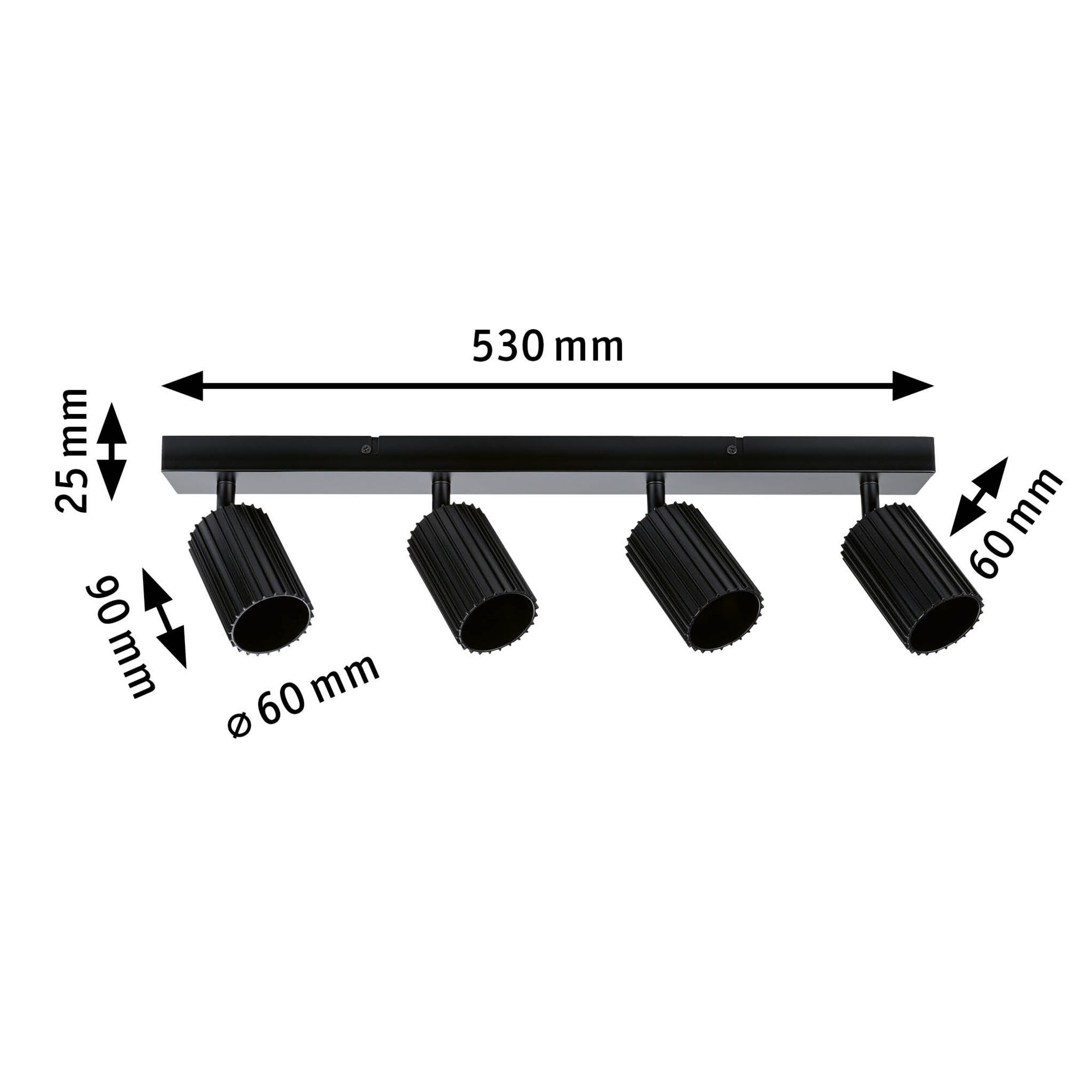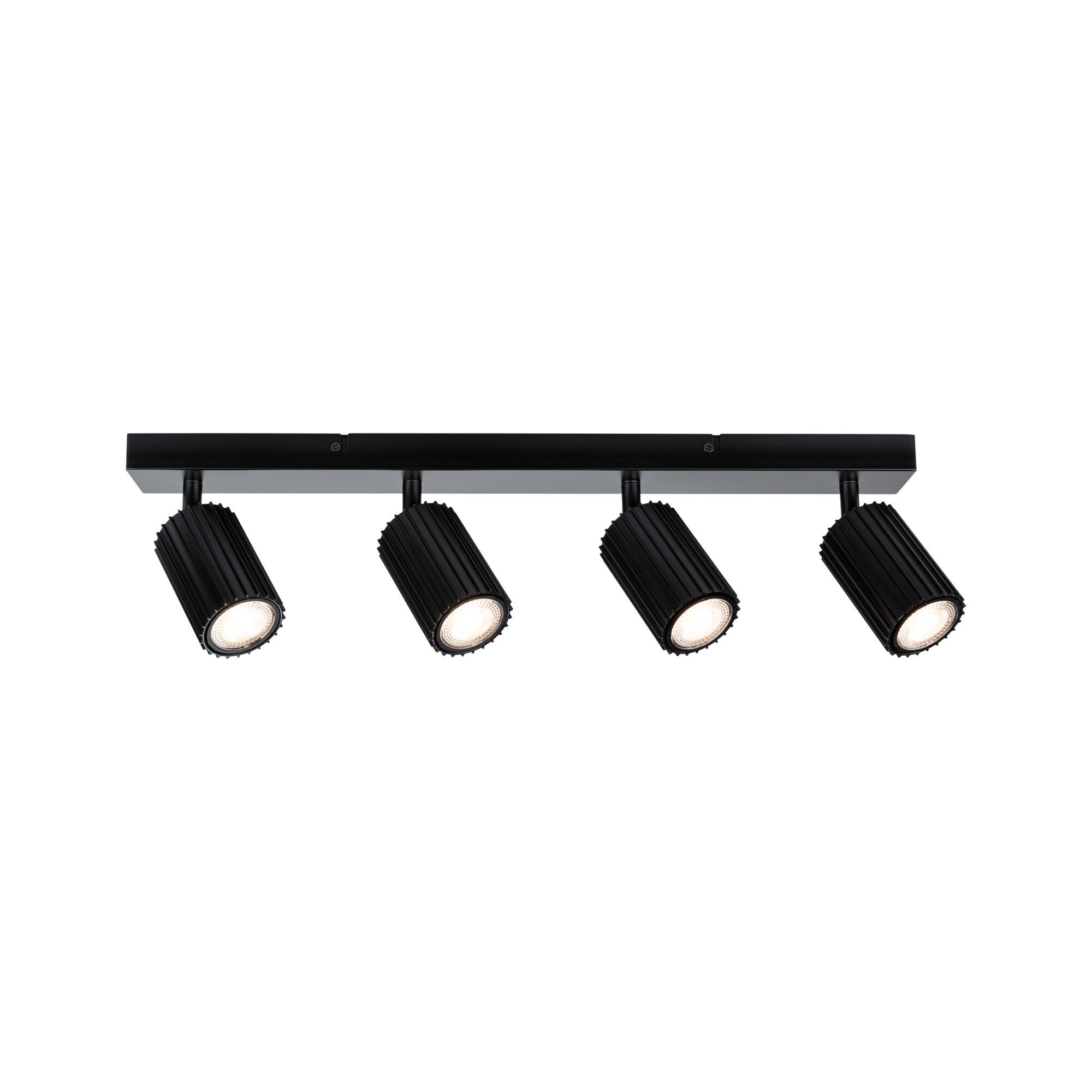 Světlo má čtyři válcové hlavice v matné černé barvě s výraznou lamelovou strukturou, která působí moderně a elegantně. Konstrukce je celokovová, což zajišťuje dlouhou životnost a odolnost. Čistý design snadno zapadne do různých stylů současných interiérů.
