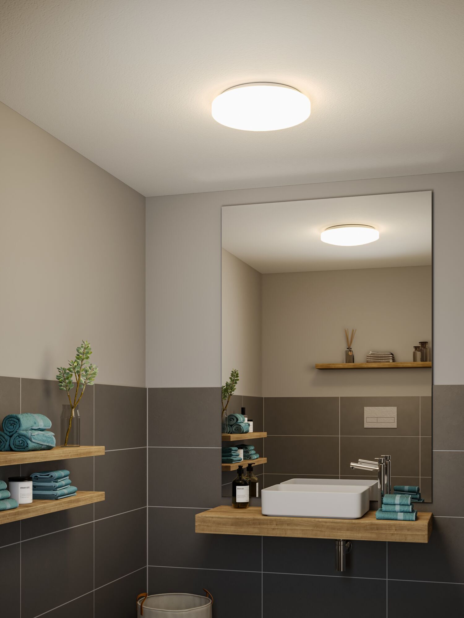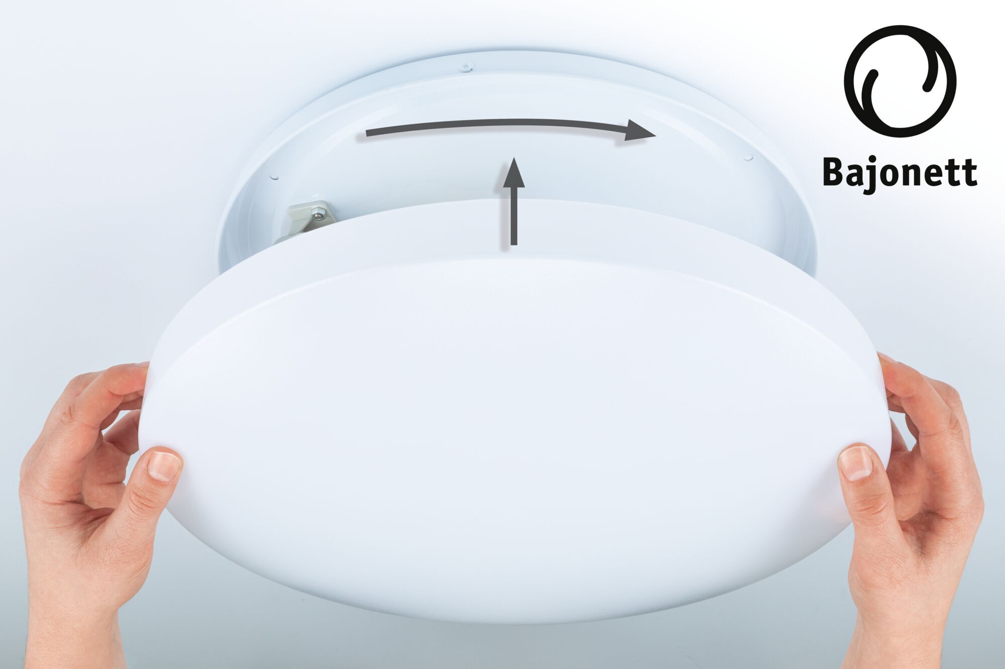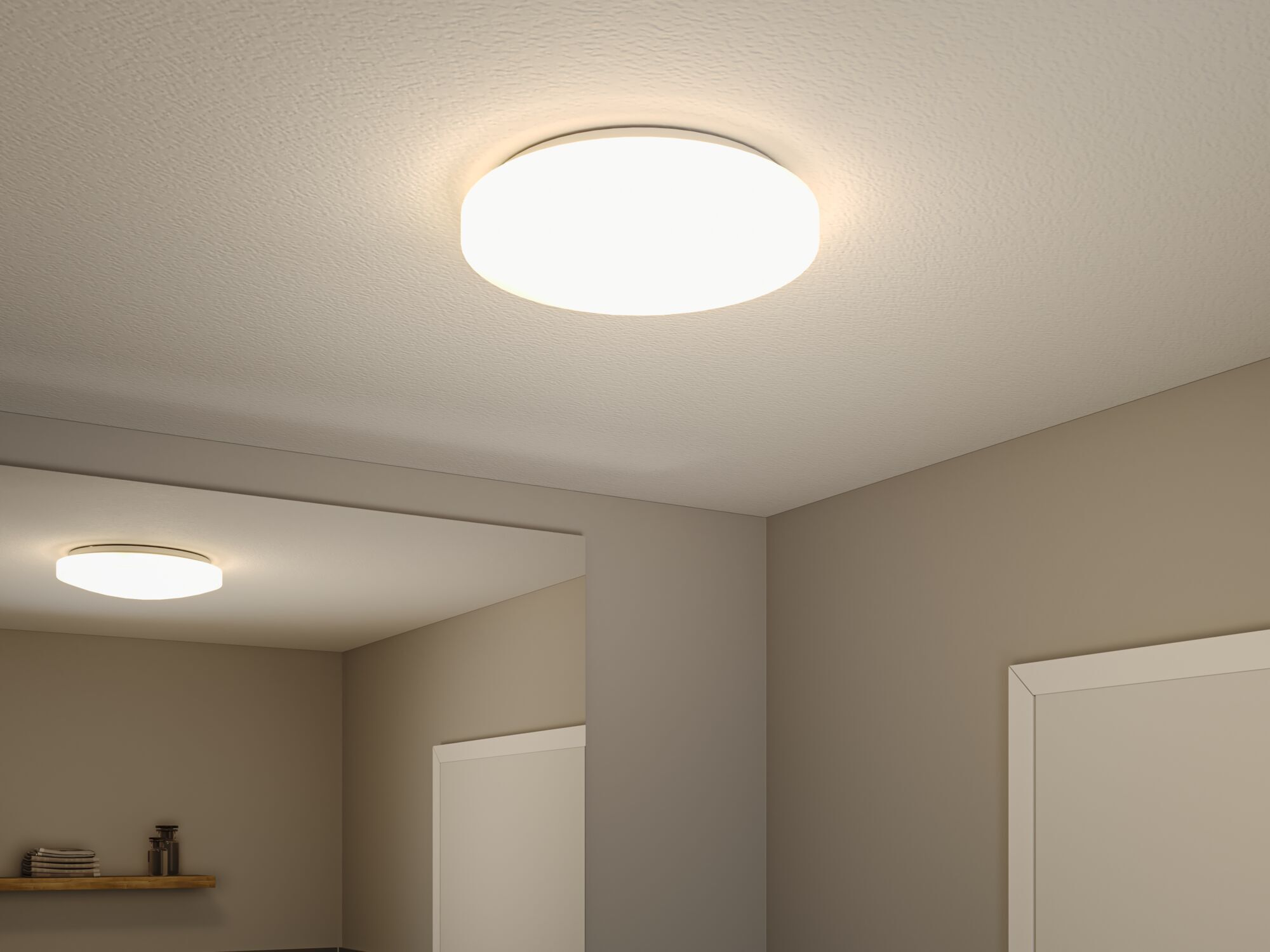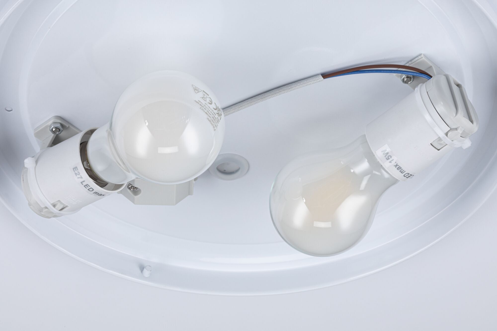 Výška: 95 mm, Třída ochrany: II, Stmívatelné: ano, záleží na použité žárovce, Průměr: 350mm, Ochrana IP: IP44, Příkon sv. zdroje: 18 W, Celkový příkon: 36W, Napětí: 230V, Patice: E27, Vč. světelného zdroje: ano, Materiál: plast, Barva: bílá, Počet světelných zdrojů: 2