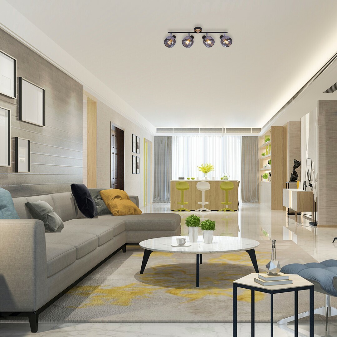 Čtyřnásobné bodové svítidlo Salazar vyrobeno z kombinace kovu a skla bude charakteristickým a atraktivním doplňkem vašeho domácího zařízení. Doporučujeme ho primárně do obývacího pokoje, ale můžete si ho umístit i na chodbu. Černé tělo má dubový vzor a je doplněno kulatým ozdobným podstavcem a skleněným stínítkem v kouřové barvě. Čtyři stínidla jsou v jedné linii. Díky nastavitelným hlavám svítidla je možné světlo svítidla ovládat podle přání. Bodové svítidlo lze použít se čtyřmi světelnými zdroji s výkonem každého do 40 W, patice typu E14. Světlo je jemně filtrované zpod tmavých stínítek svítidla Salazar, které vyzařují příjemnou a útulnou atmosféru. Aby jste dosáhli dokonalý efekt, doporučujeme používat zdroje teplého bílého světla. Šířka čtverného bodového svítidla Salazar je 700 mm a jeho průměr je 80 mm. Tento model se dodává bez žárovek.
