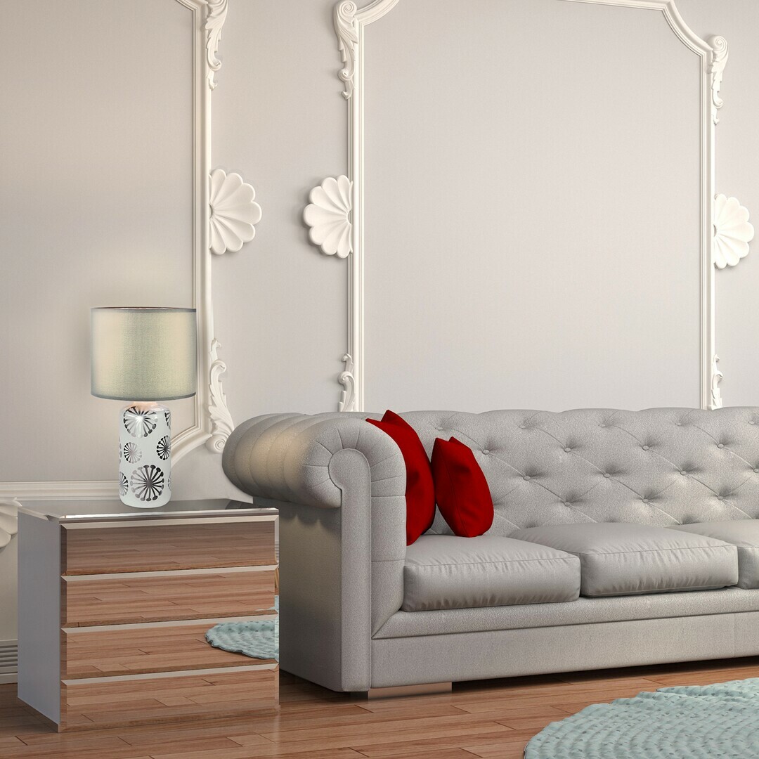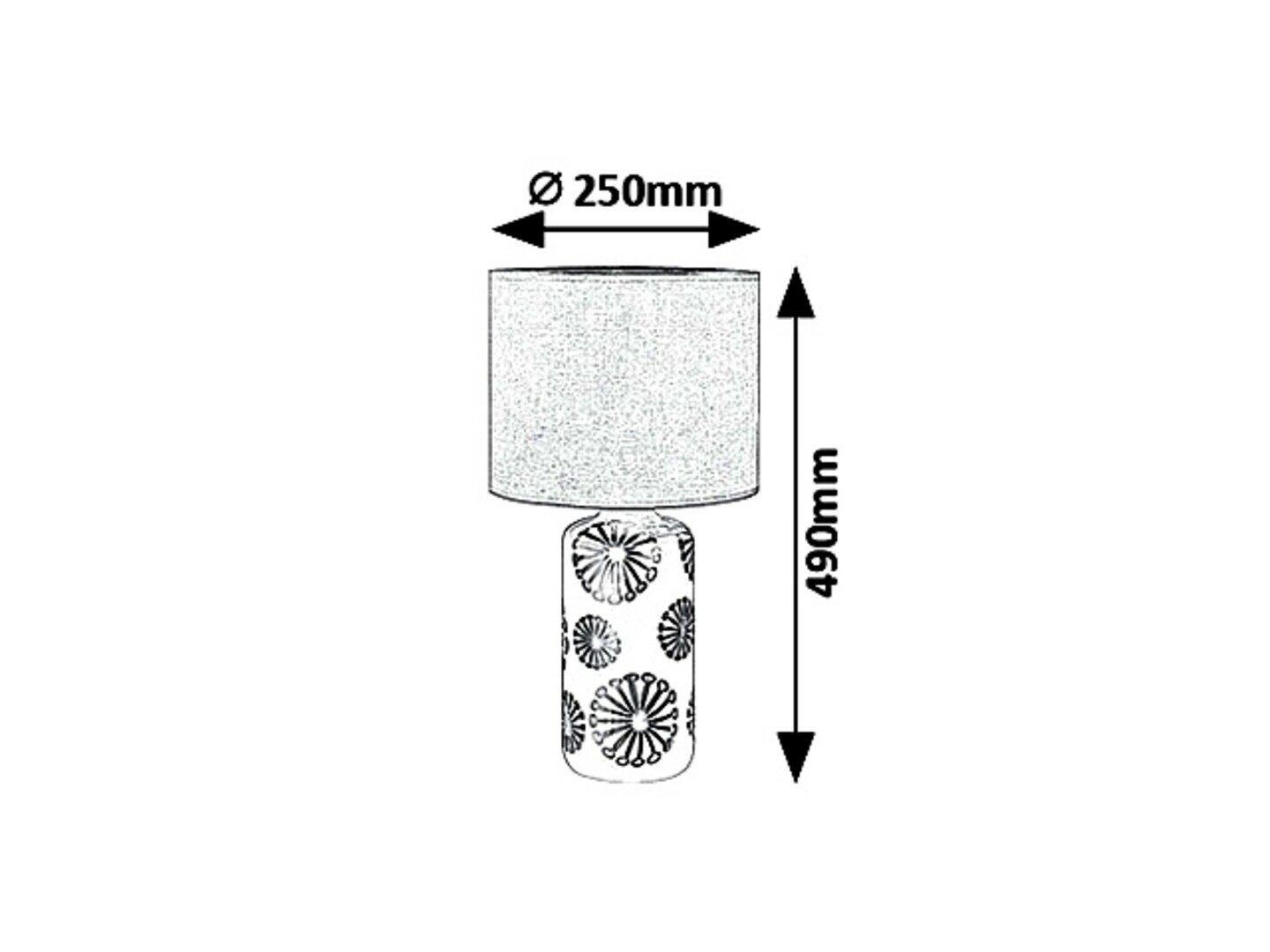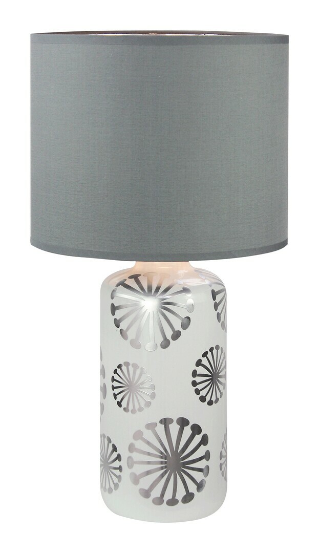 Stolní svítidlo Ginger s keramickým podstavcem ve tvaru láhve a tradičním textilním stínítkem bude zábavným doplňkem vašeho domova. Masivní podstavec charakteristického tvaru je zdobený stříbrným vzorem připomínajícím menší nebo větší květy pampelišky. Svítidlo Ginger bude čerstvým vrcholem vašeho moderního obývacího pokoje, když se položí na nižší stůl. Světlo je jemně filtrované zpod šedého válcovitého stínítka stolního svítidla, které vytváří příjemnou atmosféru v dané místnosti. Ginger lze použít se zdrojem světla s výkonem až 60 W, patice typu E27. Pokud chcete mít útulnou, intimní atmosféru, použijte žárovku vyzařující teplé bílé světlo. Rozměry stolního svítidla vybaveného kabelem a spínačem jsou: šířka 490 mm, výška 250 mm. Tento model se dodává bez žárovky.