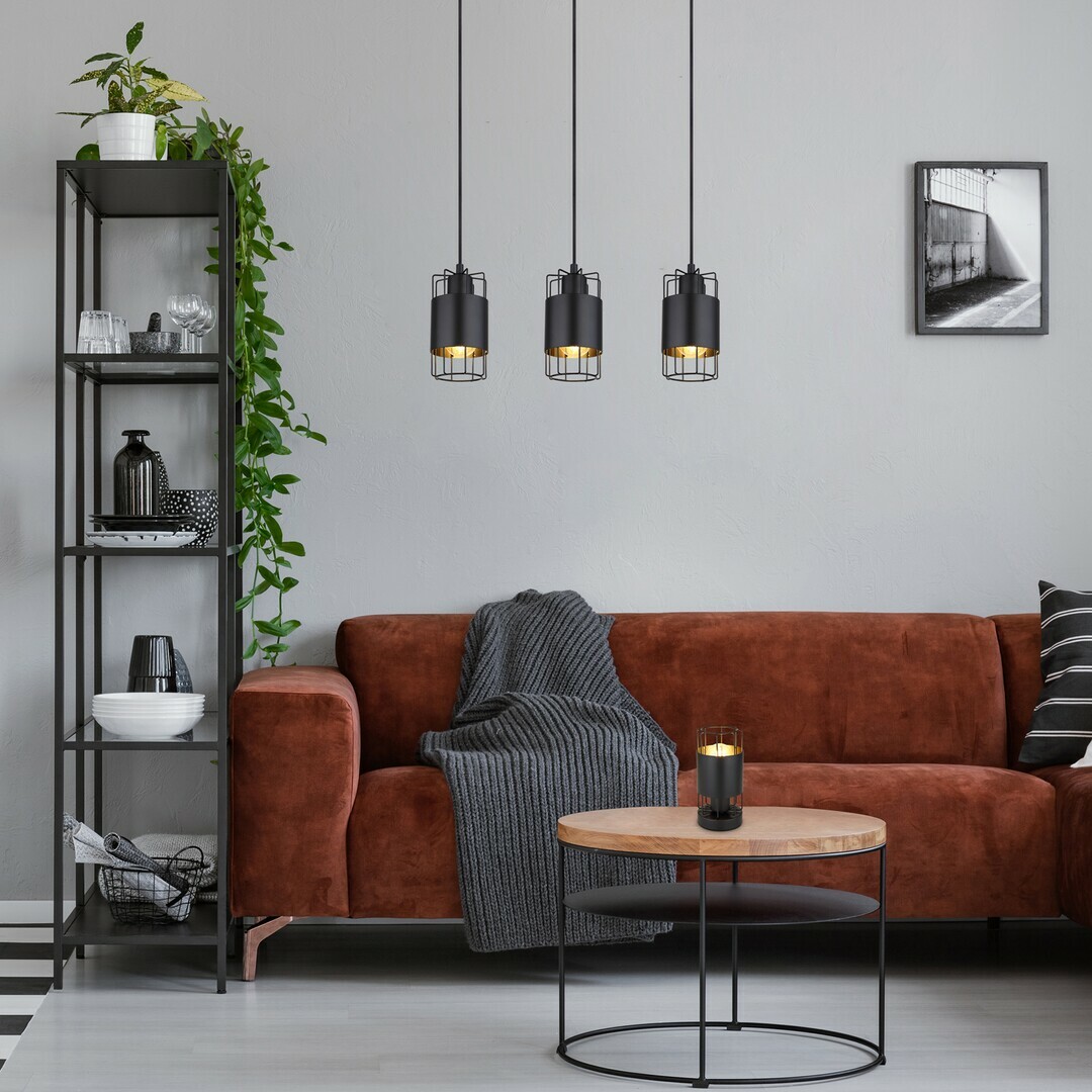 Styl: Industriální, Typ: Závěsná svítidla, Technologie LED: ne, Stupeň krytí: IP20, Barva: černá, Materiál: kov, Zdroj světla součástí: ne, Záruka: 2 roky, Počet světelných zdrojů: 3, Patice: E27, Příkon světelného zdroje: 40 W, Příkon: 120 W, Napětí: 230V, 50Hz, Průměr: 100.0 mm, Délka: 500.0 mm, Výška: 1500.0 mm, Hmotnost: 1995 g, Textilní kabel: ano, Stupeň ochrany: I