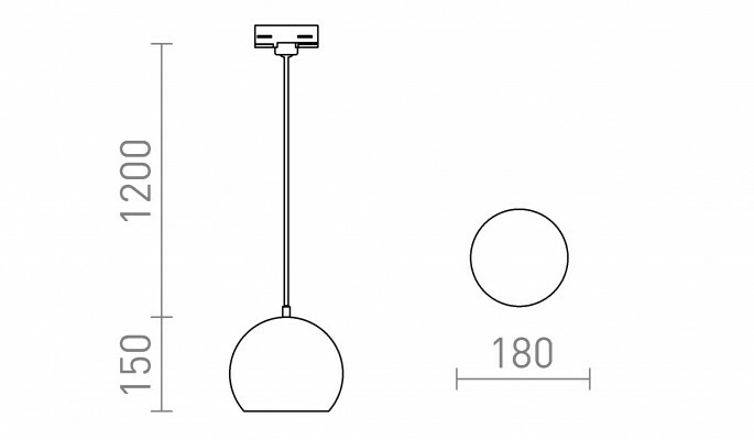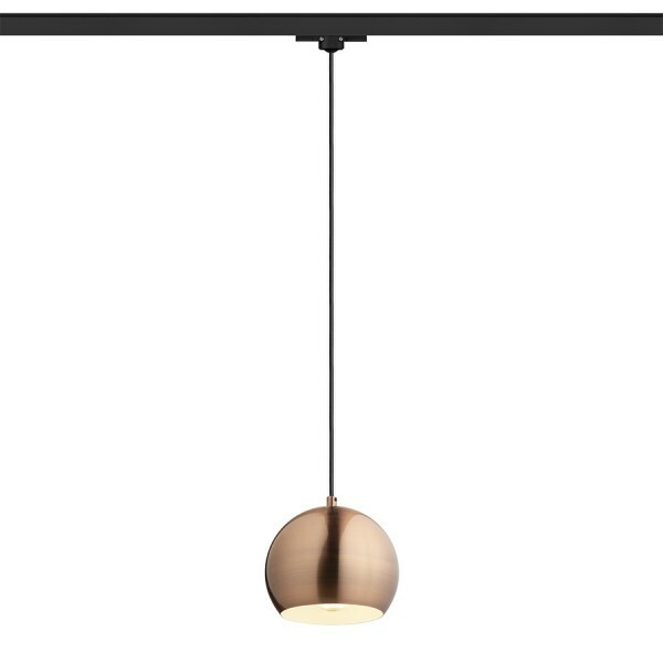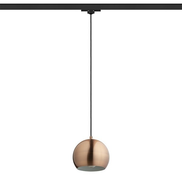 Kulaté kovové závěsné svítidlo pro použití se žárovkou E27. Přívodní kabel je zakončen adaptérem do tříokruhové lišty.