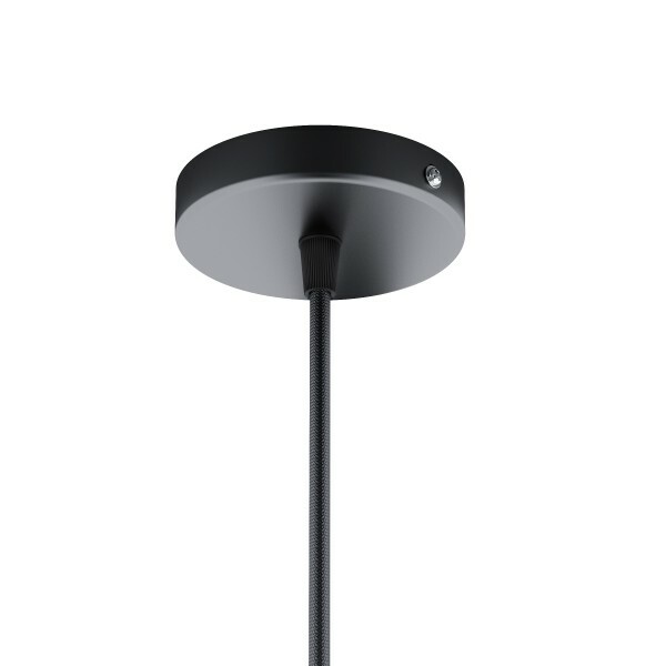 Závěsná sada s černou lakovanou kruhovou základnou, textilním kabelem a kovovou paticí E27. Vhodné pro samostatné použití nebo zavěšení lehkých stínidel.