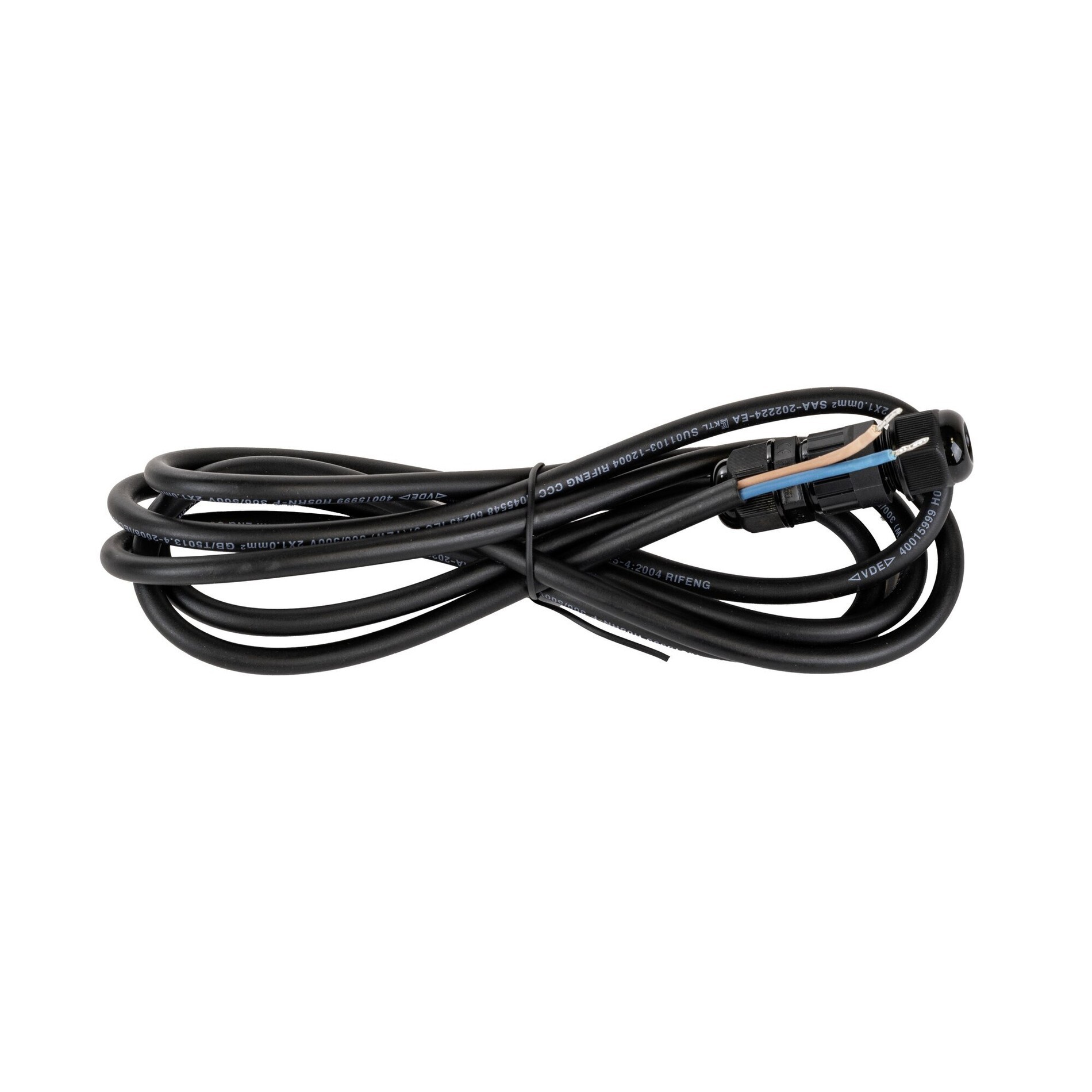 Kabel je v černém provedení, s robustní izolací a zakončený vodotěsným konektorem. Konstrukce je navržena pro dlouhou životnost a spolehlivost v průmyslovém prostředí nebo exteriéru.