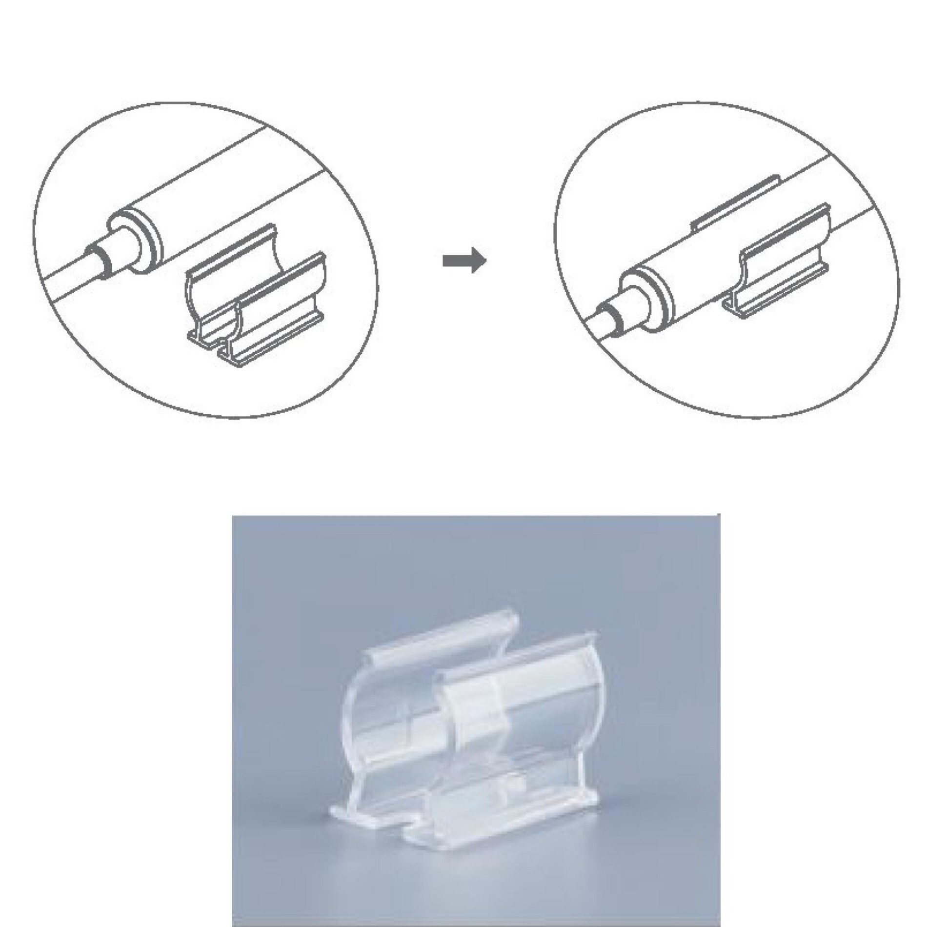 Klip je vyroben z průhledného plastu, má kompaktní tvar přizpůsobený pro bezpečné uchycení LED pásku. Díky nenápadnému provedení neruší vzhled instalace a je vhodný pro různé typy povrchů.