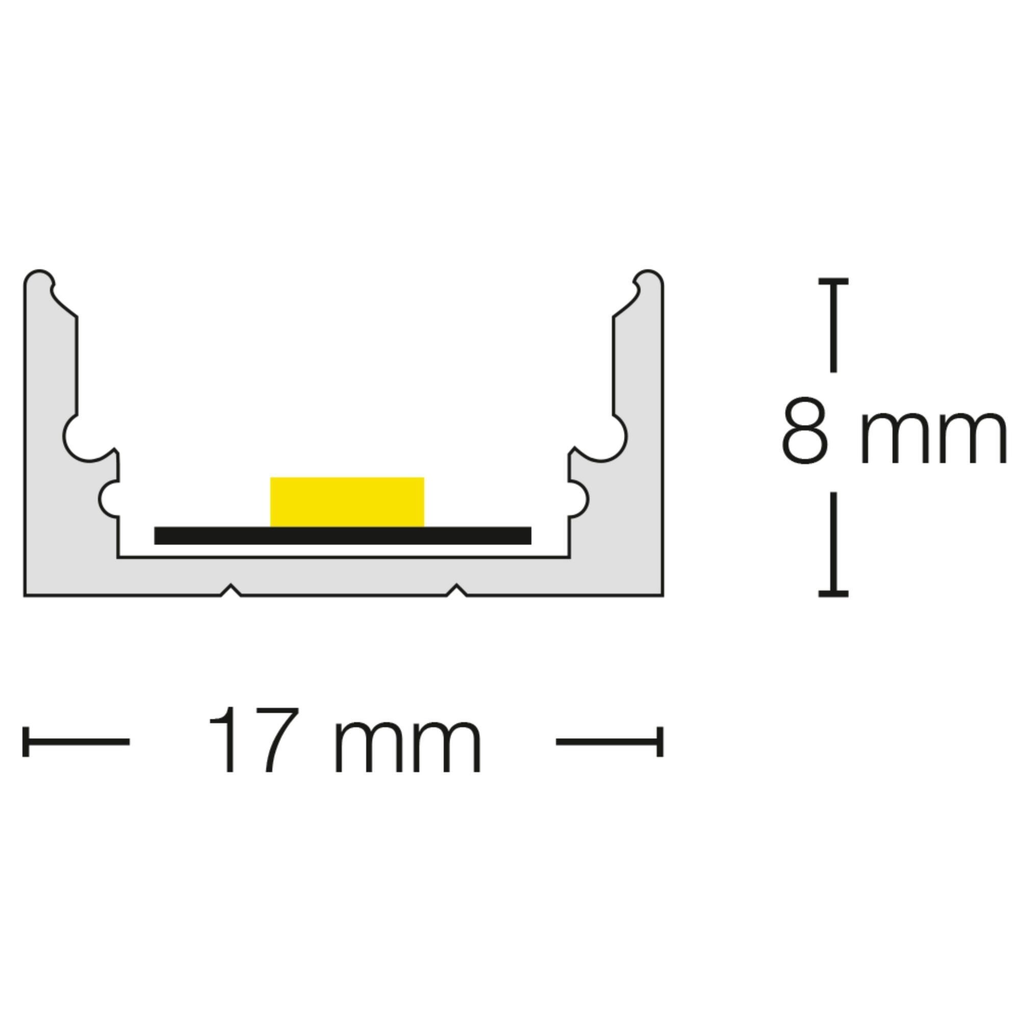 Profil má jednoduchý, moderní tvar s nízkou výškou 8 mm a šířkou 17 mm. Je vyroben z hliníku s černou práškovou povrchovou úpravou, která zajišťuje odolnost a elegantní vzhled. Vnitřní prostor profilu (výška 6,8 mm, šířka 12,3 mm) umožňuje instalaci většiny běžných LED pásků. Konstrukce je vhodná pro použití s čirým nebo opálovým krytem.