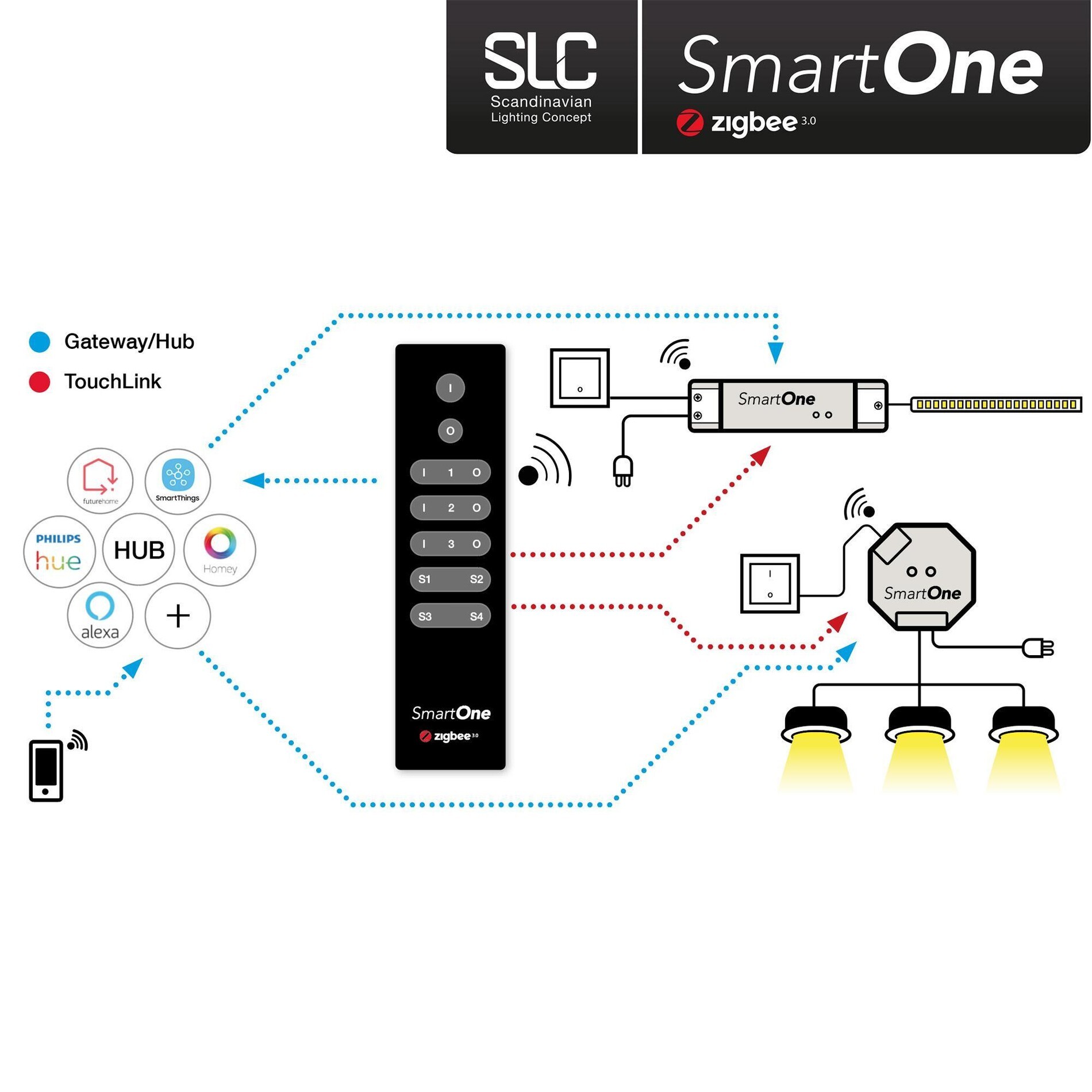 Moderní dálkové ovládání SLC SmartOne Zigbee je určeno pro pohodlné řízení až tří zařízení nebo skupin v chytré domácnosti. Využívá nejnovější protokol Zigbee 3.0, což umožňuje snadnou integraci s různými systémy, jako jsou Homey, Philips Hue, Ikea, Samsung Smartthings, Amazon Alexa nebo Future Home. Ovladač nabízí možnost programování čtyř scén a funkci stmívání. Díky magnetickému držáku jej lze jednoduše připevnit na stěnu. Napájení je zajištěno baterií, která je součástí balení.