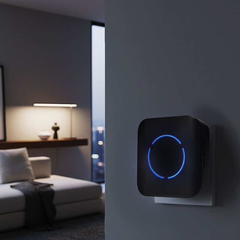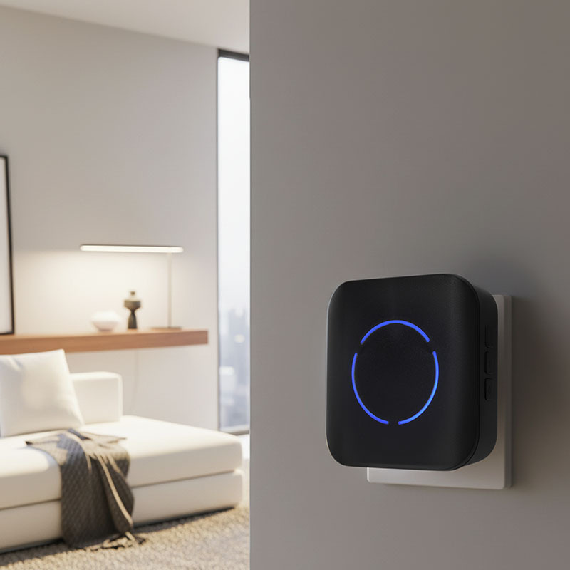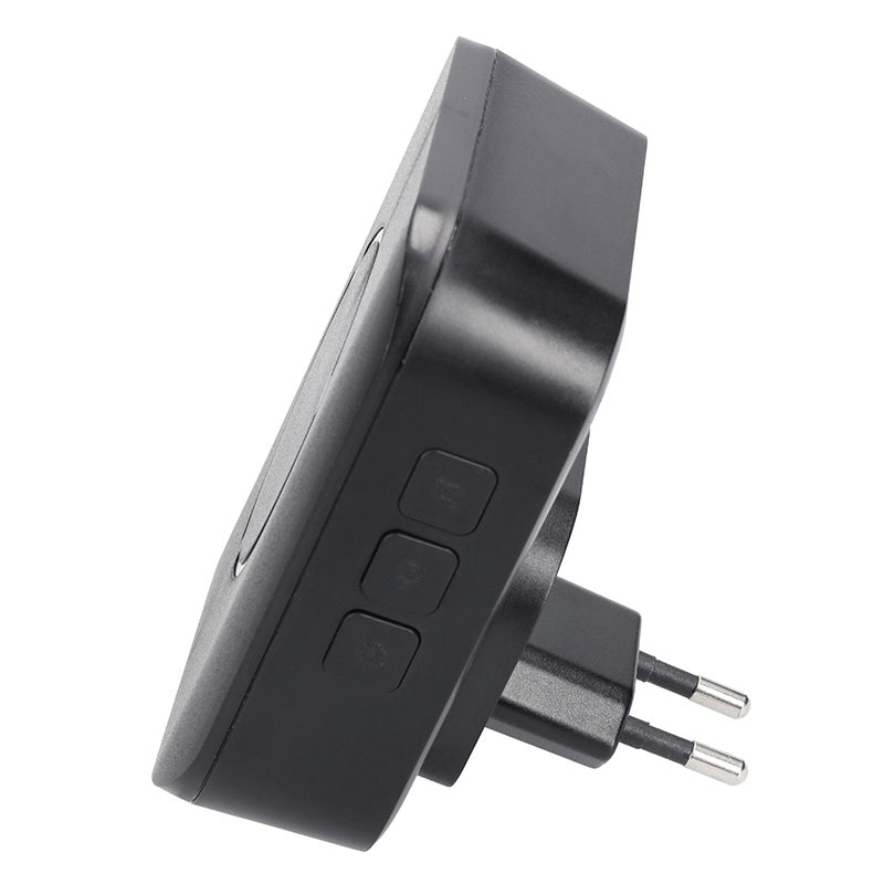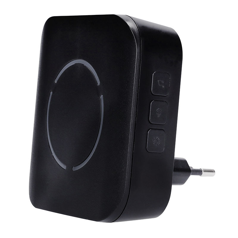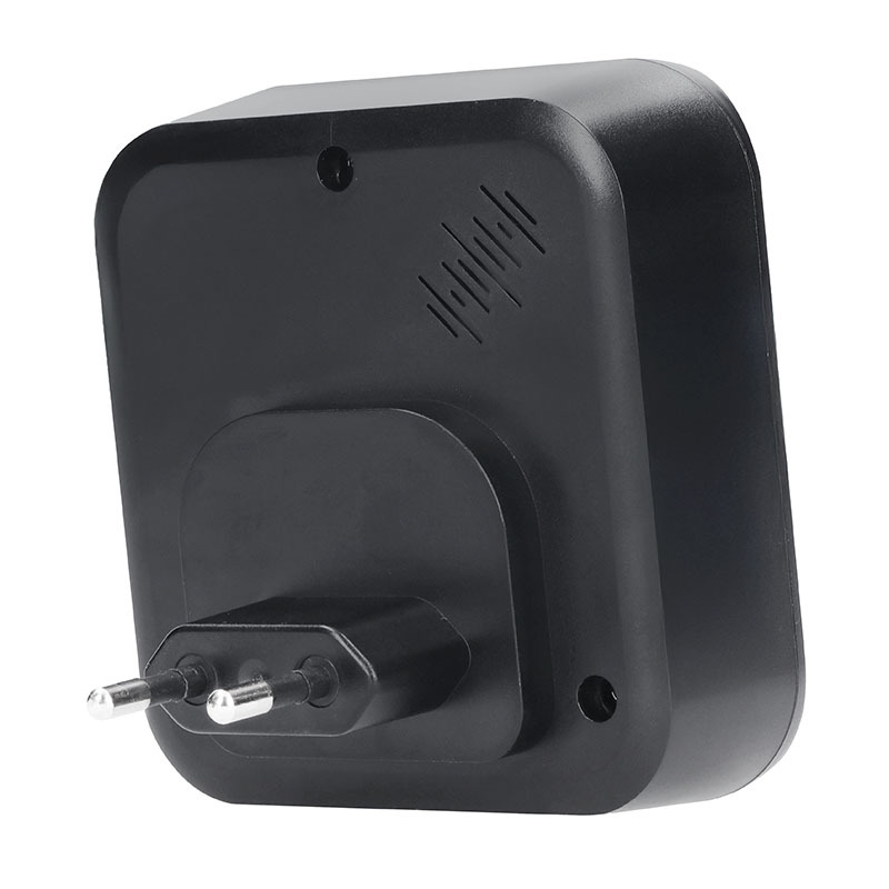 Bezdrátový zvonek do zásuvky pro rychlé doplnění domovního zvonění bez sekání do zdi a bez natahování kabelů. Přijímač se zapojuje do AC 230 V a tlačítko je napájené baterií; zvonění doplňuje LED indikace na zvonku i tlačítku. Dosah signálu na otevřeném prostranství je 180 m.