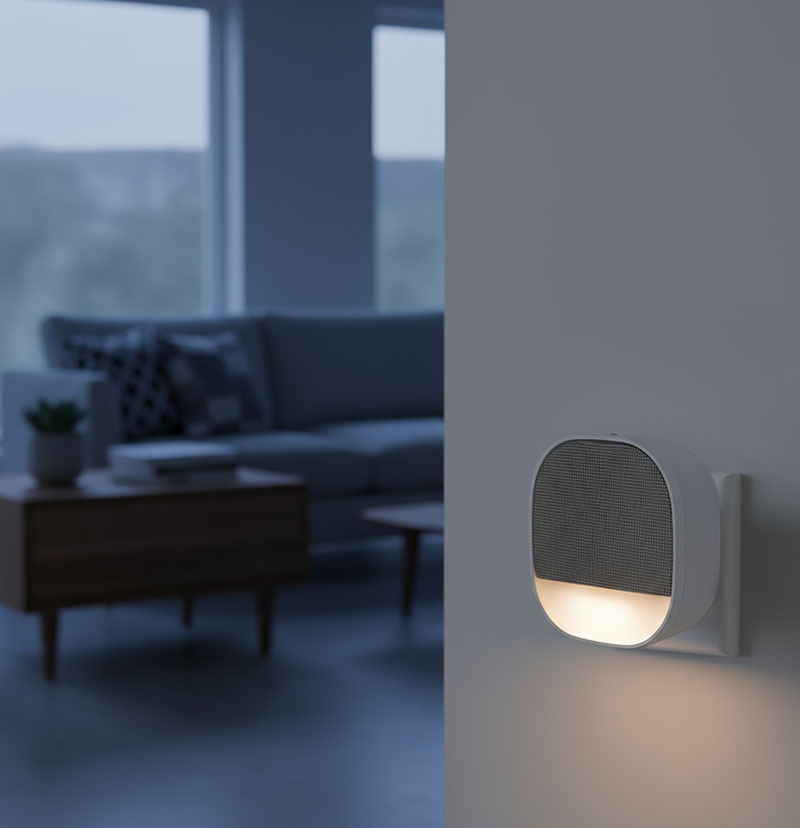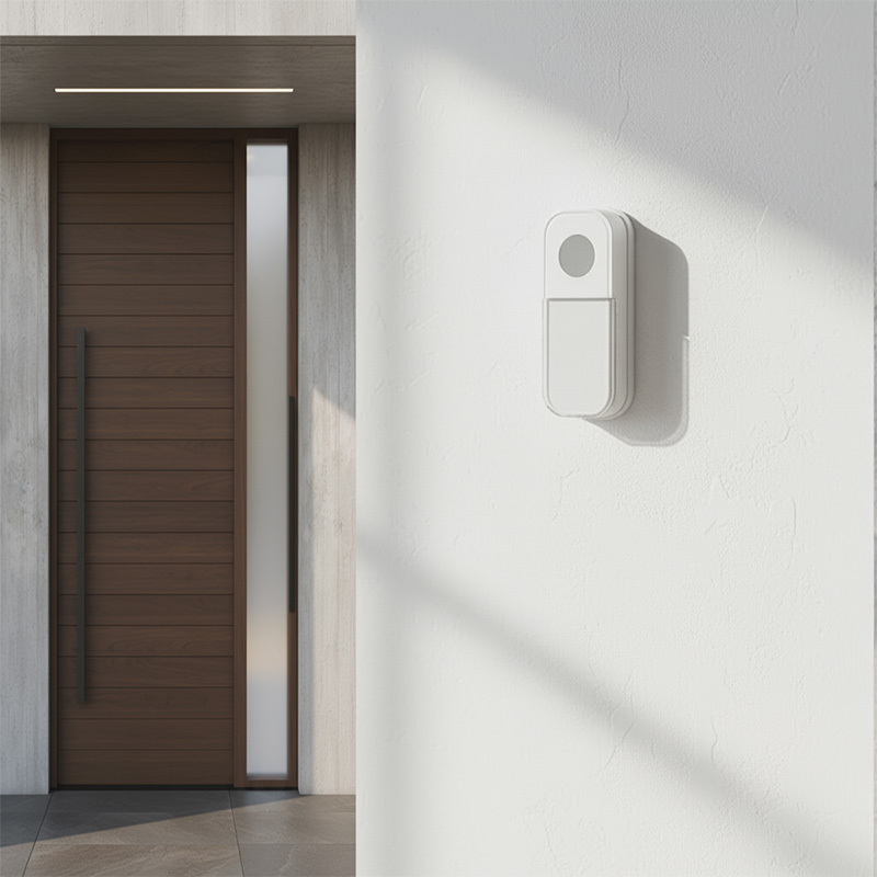 Kombinace bezdrátového zvonku a decentního nočního světélka pro chodbu, zádveří nebo předsíň. Noční světélko se při setmění automaticky zapíná soumrakovým senzorem, svítí teplou bílou barvou a díky tvarování spodní části neoslňuje. Zvonění je kromě zvuku signalizované i výrazným blikáním stejné světelné plochy.