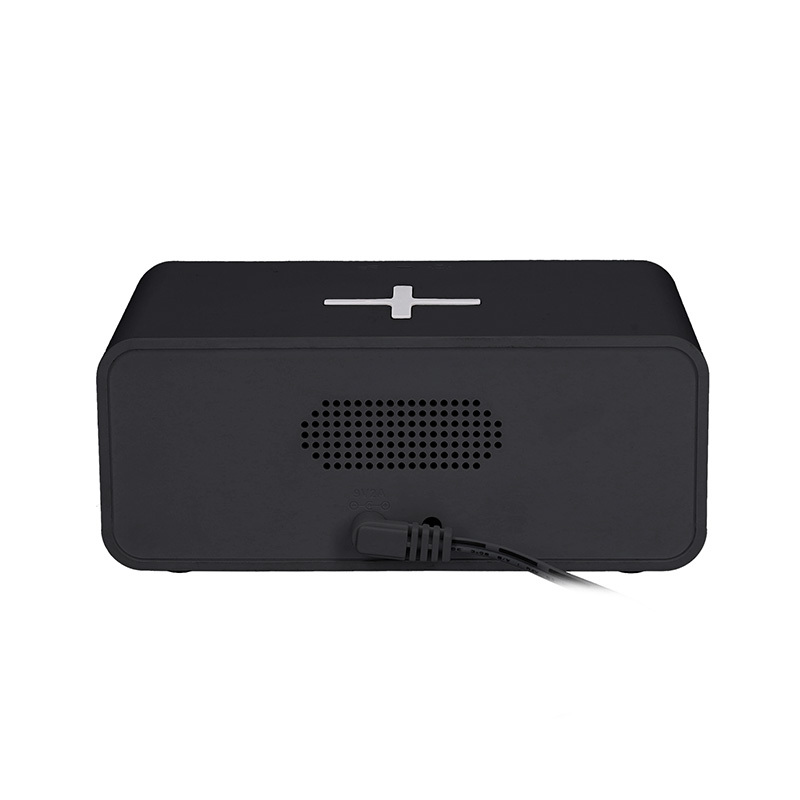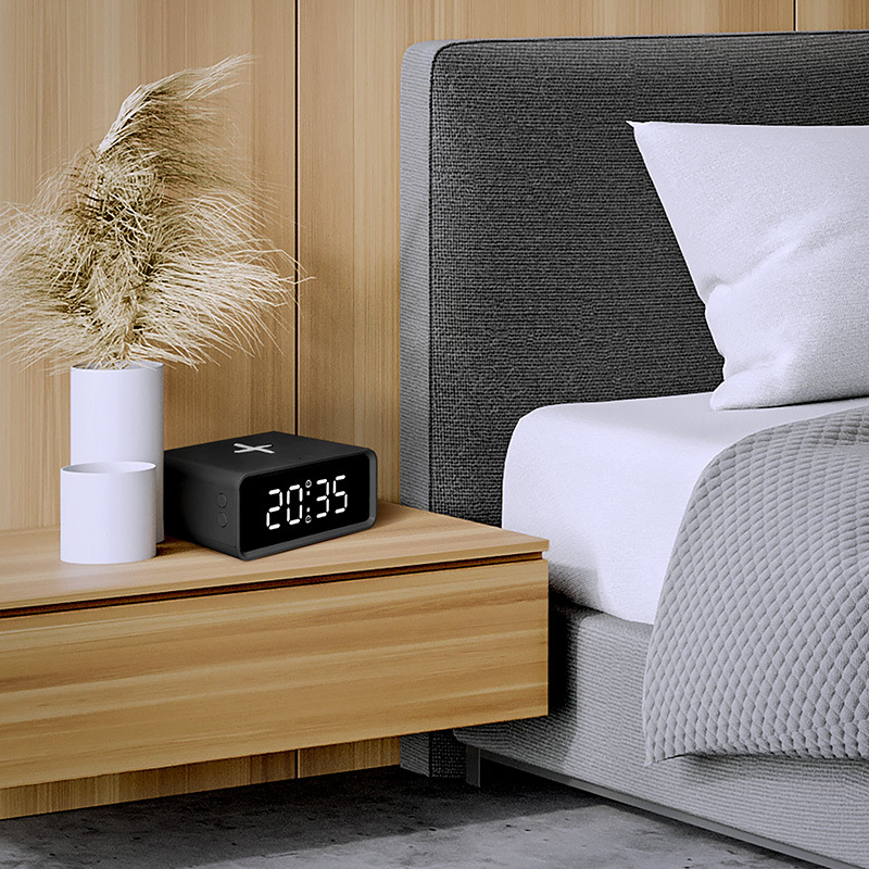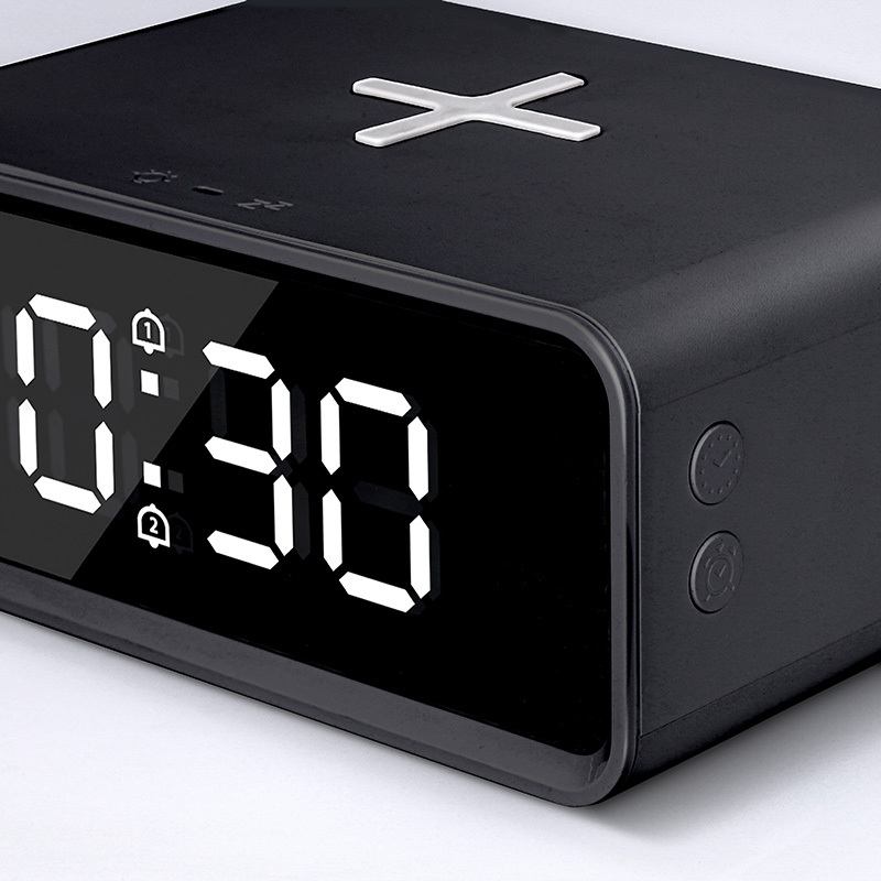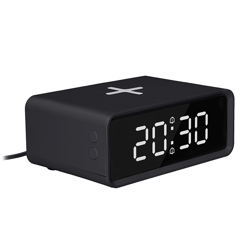 Budík s bezdrátovým nabíjením – stylový a praktický doplněk.Tento moderní budík kombinuje bezdrátovou nabíječku (Qi, max. 15W), hodiny, teploměr a dvojitý budík s funkcí snooze. Velký LED displej s vysokým rozlišením umožňuje volbu mezi zobrazením pouze času nebo střídáním času a teploty. Nastavitelný jas displeje (3 úrovně + vypnutí) zajišťuje pohodlné používání i v noci. Protiskluzová podložka udrží telefon bezpečně na místě během nabíjení. Napájení přes DC5V-9V/2-3A, záložní baterie CR2032 uchová nastavení při výpadku napájení.