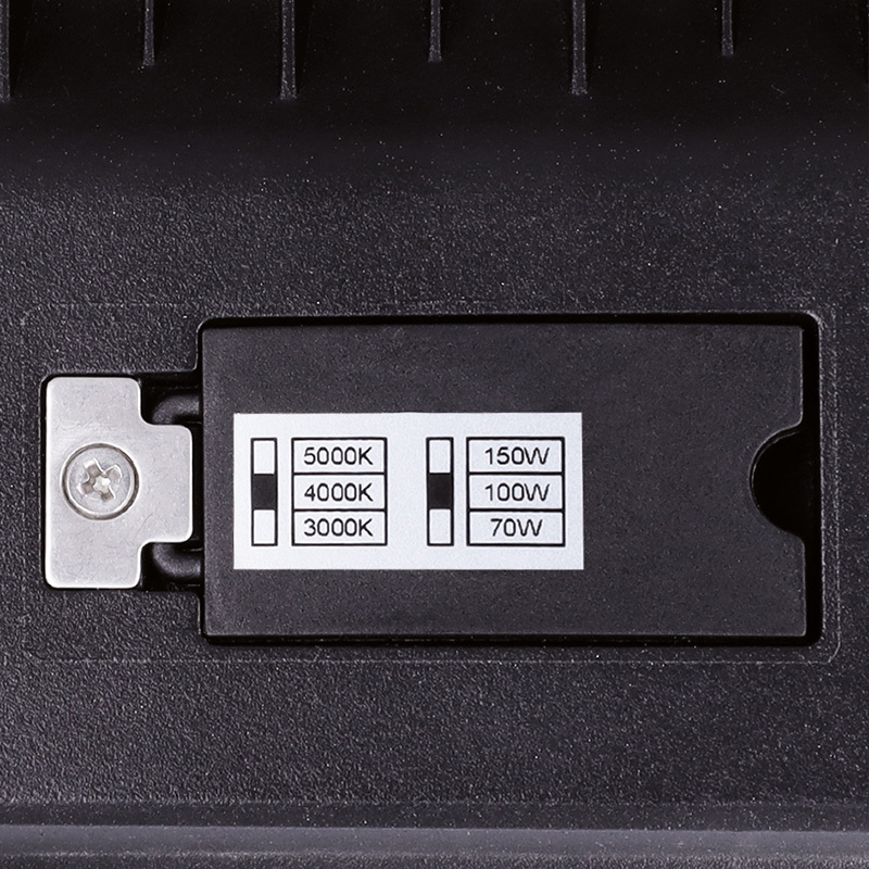 Nejvýkonnější model z řady TOP reflektorů nabízí masivní světelný výkon až 21 000 lm při plných 150W, což jej činí ideálním pro nasvícení velkých areálů, sportovišť nebo průmyslových zón. Díky přepínatelnému výkonu lze reflektor nastavit i na 110W (15 400 lm) nebo 70W (9 800 lm), čímž lze optimalizovat spotřebu elektrické energie. Možnost změny teploty světla v rozsahu 3000K–5000K přidává na univerzálnosti zařízení.