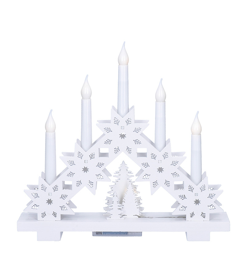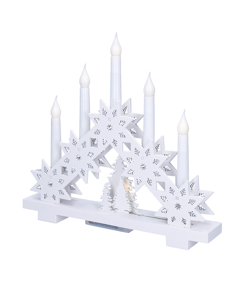 Stylový dřevěný svícen s pěti LED diodami a motivem hvězd přináší moderní pojetí klasické vánoční dekorace. Bílý povrch v kombinaci s čistými liniemi působí elegantně a vkusně, zatímco teple bílé světlo navozuje klidnou a sváteční náladu. Svícen má rozměry 32 × 30 × 5 cm a perfektně vynikne na parapetu, polici nebo slavnostně prostřeném stole.
