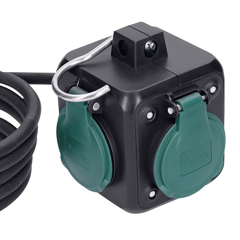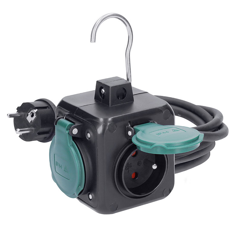 Prodlužovací přívod s gumovým kabelem a třemi zásuvkami ve tvaru kostky je perfektní volbou pro práci na zahradě, stavbě nebo v dílně. Díky kovovému háčku je možné ho pověsit na jakékoli místo. Robustní konstrukce zajišťuje spolehlivý provoz a krytím IP44 zaručuje odolnost proti stříkající vodě ze všech směrů.
