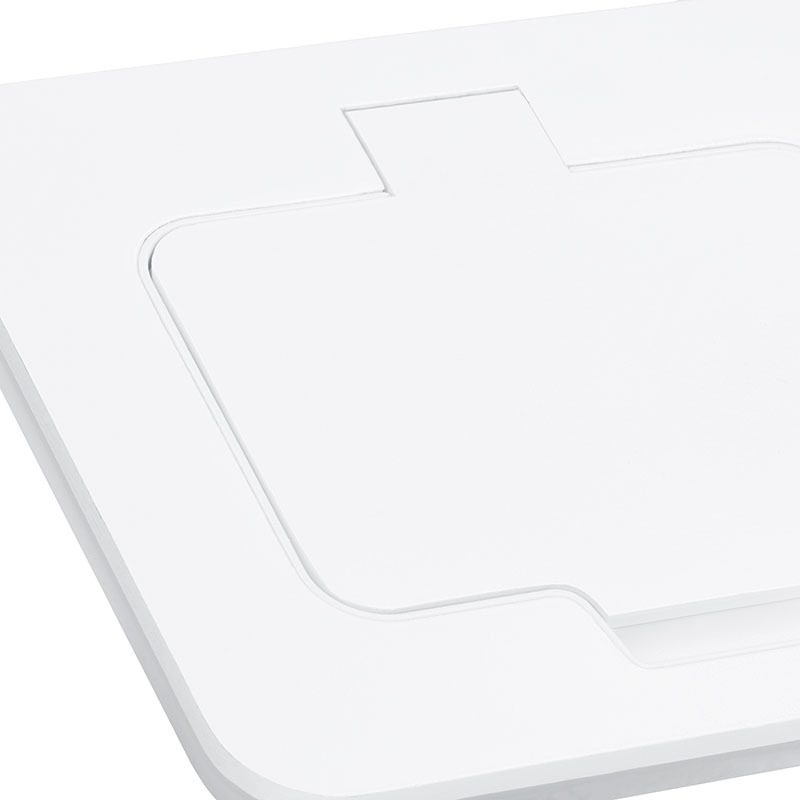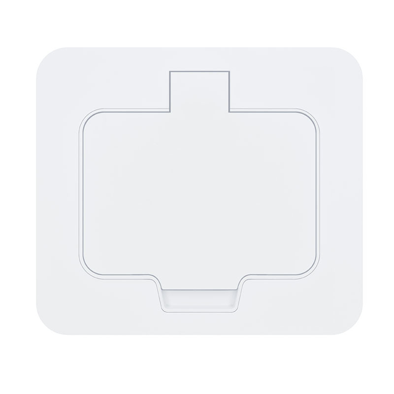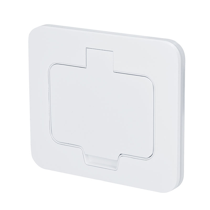 Zásuvka má obdélníkový tvar a matně bílý vrchní kryt ze slitiny zinku s povrchovou úpravou. Montážní otvory jsou skryté pod víčkem, takže na povrchu nejsou viditelné šrouby a zásuvka působí čistě i v moderních podlahách nebo obkladech. Pevné víčko s pružinou podporuje automatické zavírání, otevření je až do úhlu 120° pro pohodlnou manipulaci s přívodními kabely.